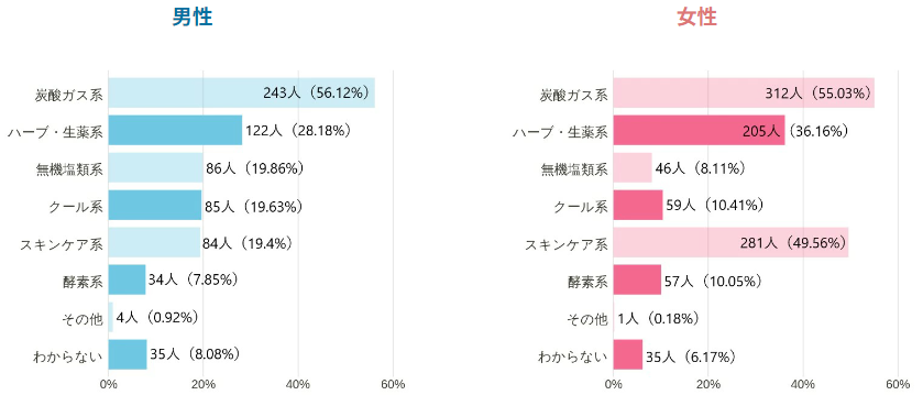 前述の美容の観点でいうと、好きな入浴剤のタイプでも大きく差が出ていることがわかります。女性の好きな入浴剤のタイプとしては、スキンケア系を挙げているかたが約半数いるのに対し、男性では2割弱で、3割もの差がついています。