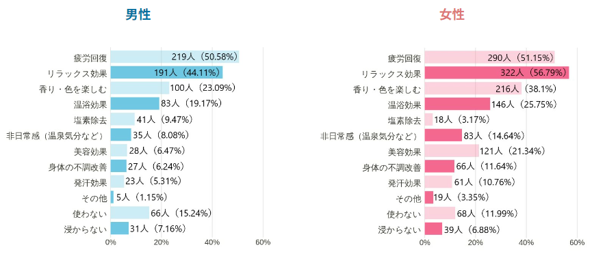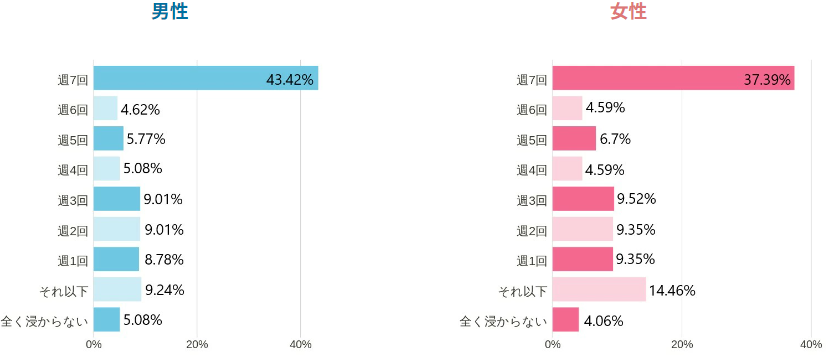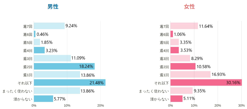このことから、湯に浸かる頻度に対しての入浴剤使用率としては、男性より女性のほうが高いと言えそうです。