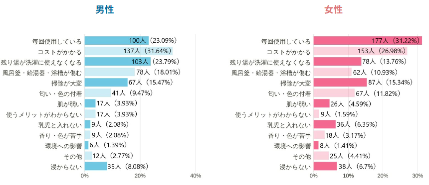なお、入浴剤を入れないときの理由としては、男女ともにトップ3が同じ理由で、コスト面や残り湯使用・風呂釜への影響等、家計や家事に影響するものが上位に挙がっていました。