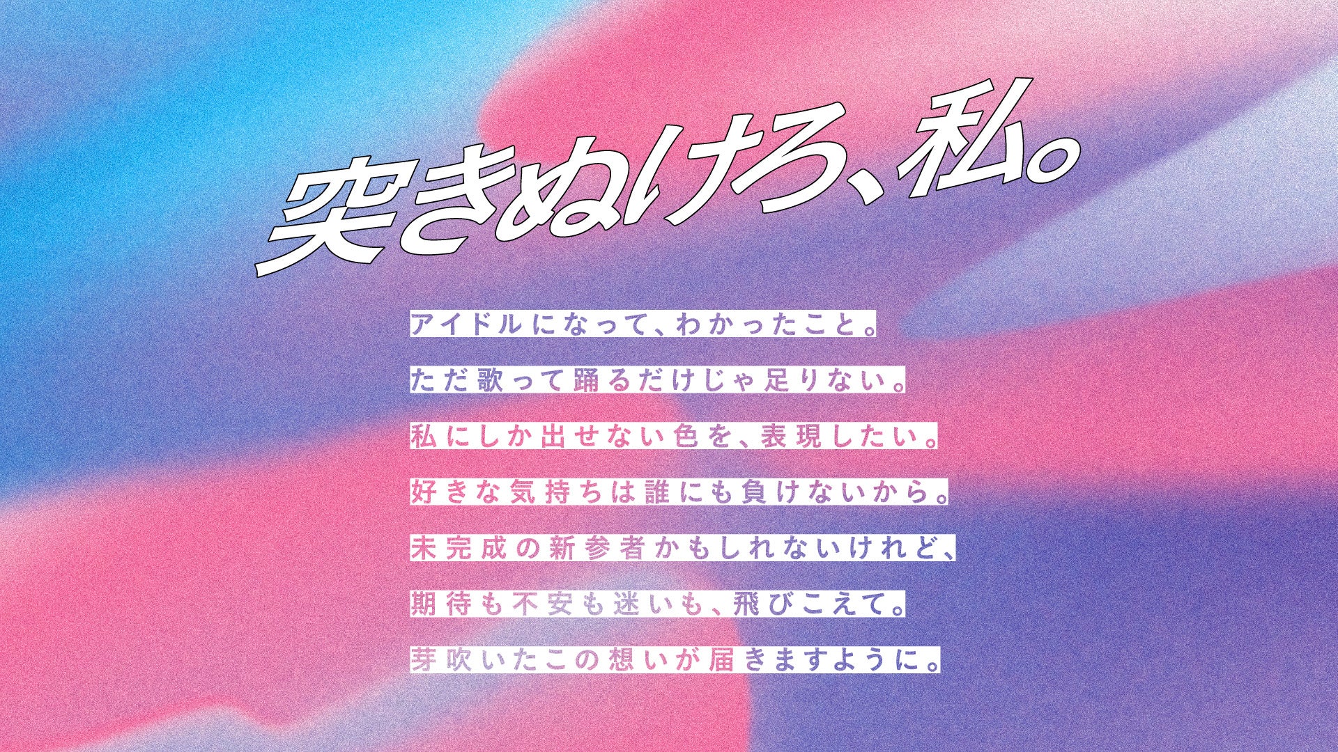 また、コピー「突きぬけろ、私。」には、坂道シリーズ3グループの新期生がアイドルとして歩み始めた今、期待も不安も迷いも飛びこえていけるように、という想いを込めました。あわせて、今回は新期生メンバー全員にもソロコピーを展開し、それぞれの想いを表現しています。