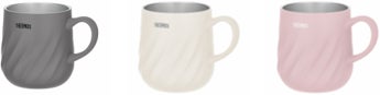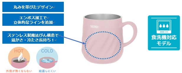 本製品は、丸みを帯びた可愛らしいデザインが特長のマグカップです。表面にはエンボス加工で立体的なラインを施し、細部までこだわり抜いたデザインに仕上げました。ステンレス製魔法びん構造で温かさ・冷たさが長持ちし、冷たい飲みものを入れても結露しにくく、温かい飲みものでも外側が熱くなりません。さらに食洗機対応なので、お手入れもカンタンです。容量は350mlと450mlの2サイズ。カラーは、ダークグレー、アイボリー、ピンクの3色をご用意しました。