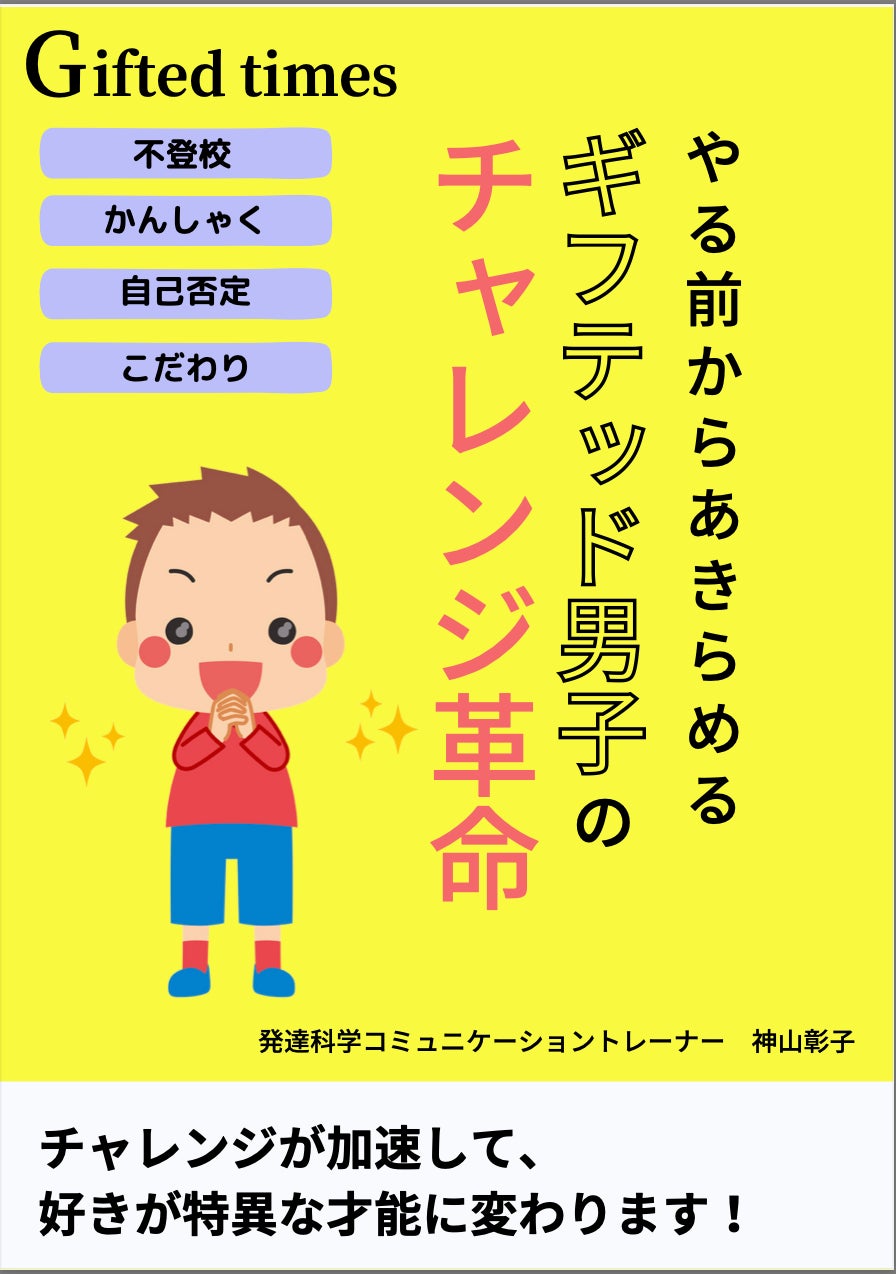 初めまして。親⼦のコミュニケーションをスムーズにして⼦どもの発達を加速する「発達科学コミュニケーション」⼦育て講座講師の神⼭彰⼦と申します。この度、ギフテッド男子を理解し、才能を伸ばすきっかけとして欲しく、ギフテッドやる気のないギフテッド男子に響く!不登校・かんしゃく・こだわり・自己否定する子がやる気になる「やる前からあきらめるギフテッド男子のチャレンジ革命」無料電子書籍をリリースいたしました。