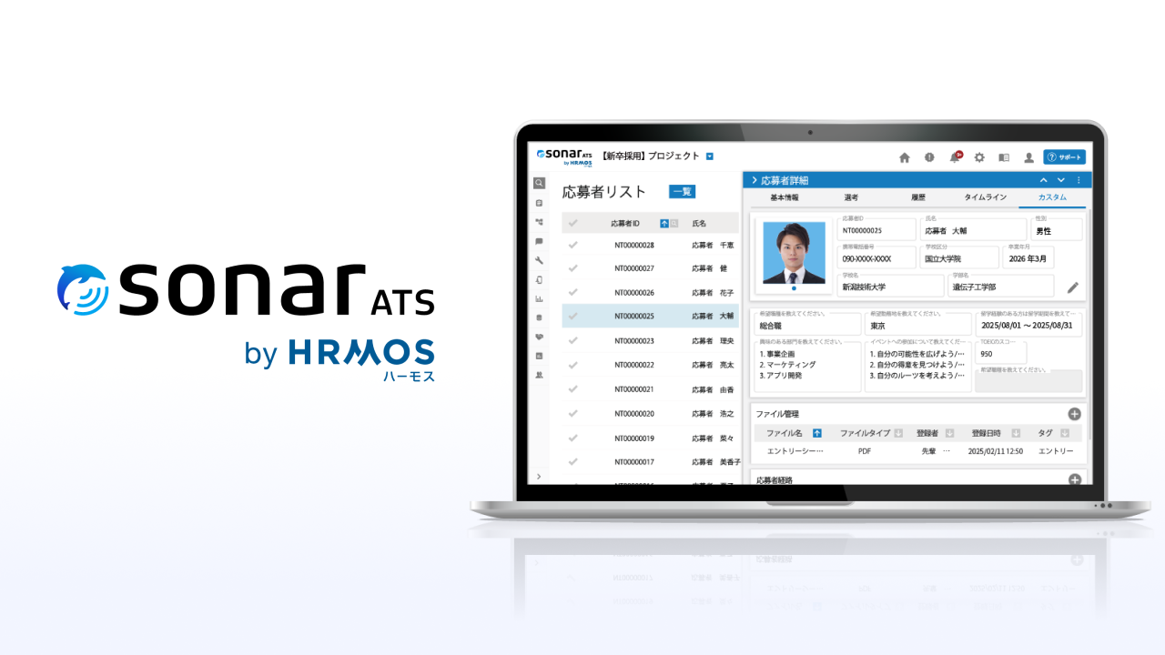 「sonar ATS by HRMOS」は、採用業務のデジタル化を通じて、各種オペレーションの自動化やリアルタイムなデータ分析による効率的な選考を実現。採用担当者の業務負荷を大幅に削減します。社内のポジションと人材要件の管理機能(sonar Connecter)を備え、求人媒体や適性検査など50以上のHRサービスと連携可能な採用管理システムとして採用担当者を支援しています。2012年よりサービス提供を開始し、株式会社NTTデータグループ、全日本空輸株式会社、ダイキン工業株式会社、トヨタ自動車株式会社、法務省、文部科学省、LINEヤフー株式会社など、累計2,400を超える企業や官公庁に利用されています。