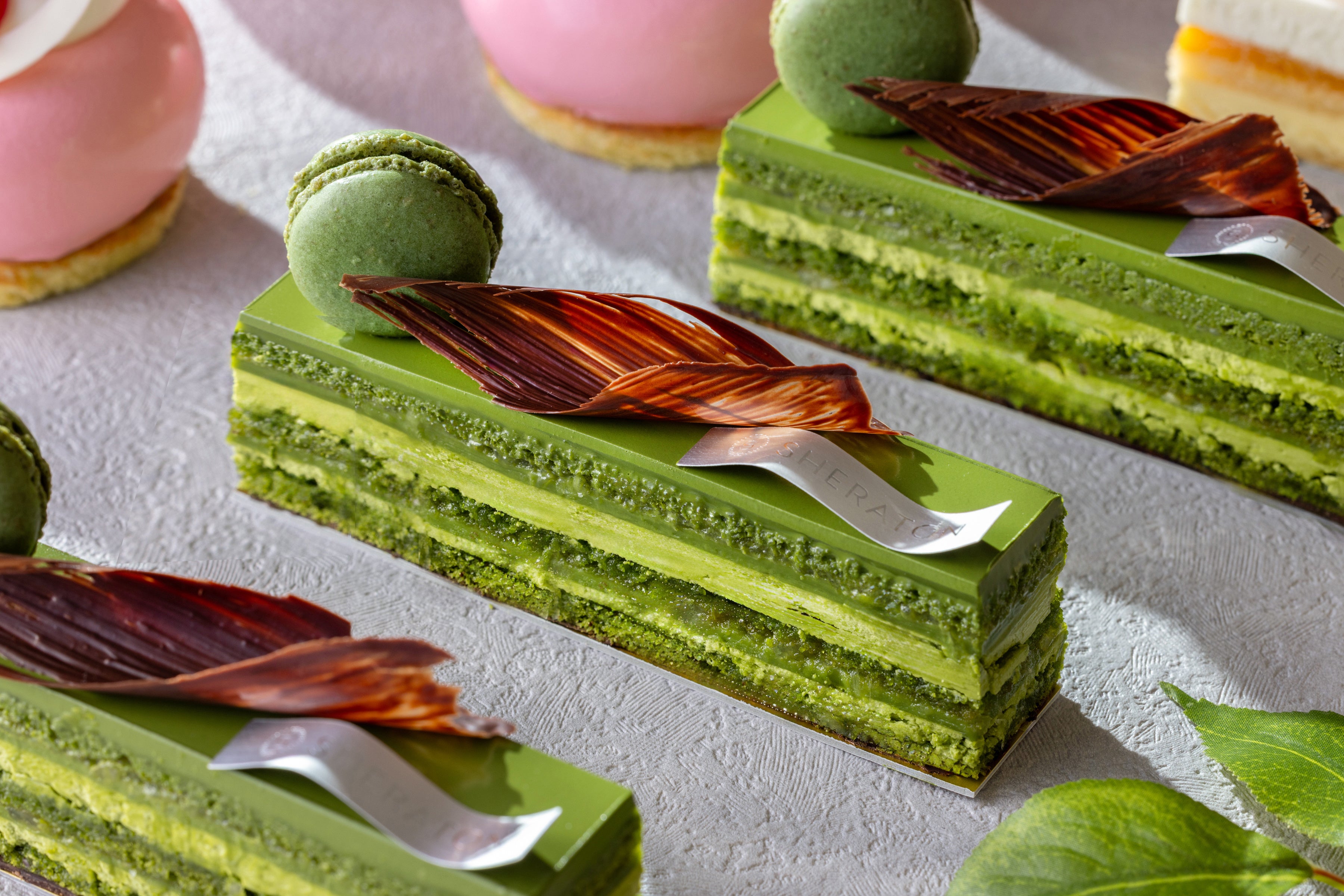 香り高い抹茶と爽やかな柑橘の余韻が織りなす和のケーキです。ビスキュイや滑らかなクリームを何層にも重ね、見た目も美しいケーキに仕立てました。間には、レモンとゆずのコンフィチュールを忍ばせており、爽やかでほのかな酸味が抹茶の奥深い味わいを一層引き立てます。