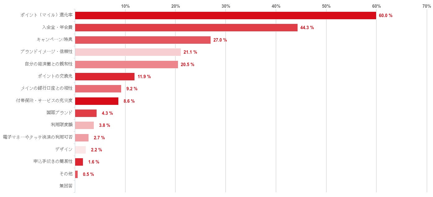 「ポイント(マイル)還元率」が60.0%と過半数を超えて最も多く、「入会金・年会費」が44.3%で次に多かった。その他には「キャンペーン・特典」を選ぶ人も多かった。