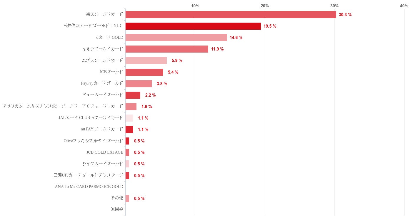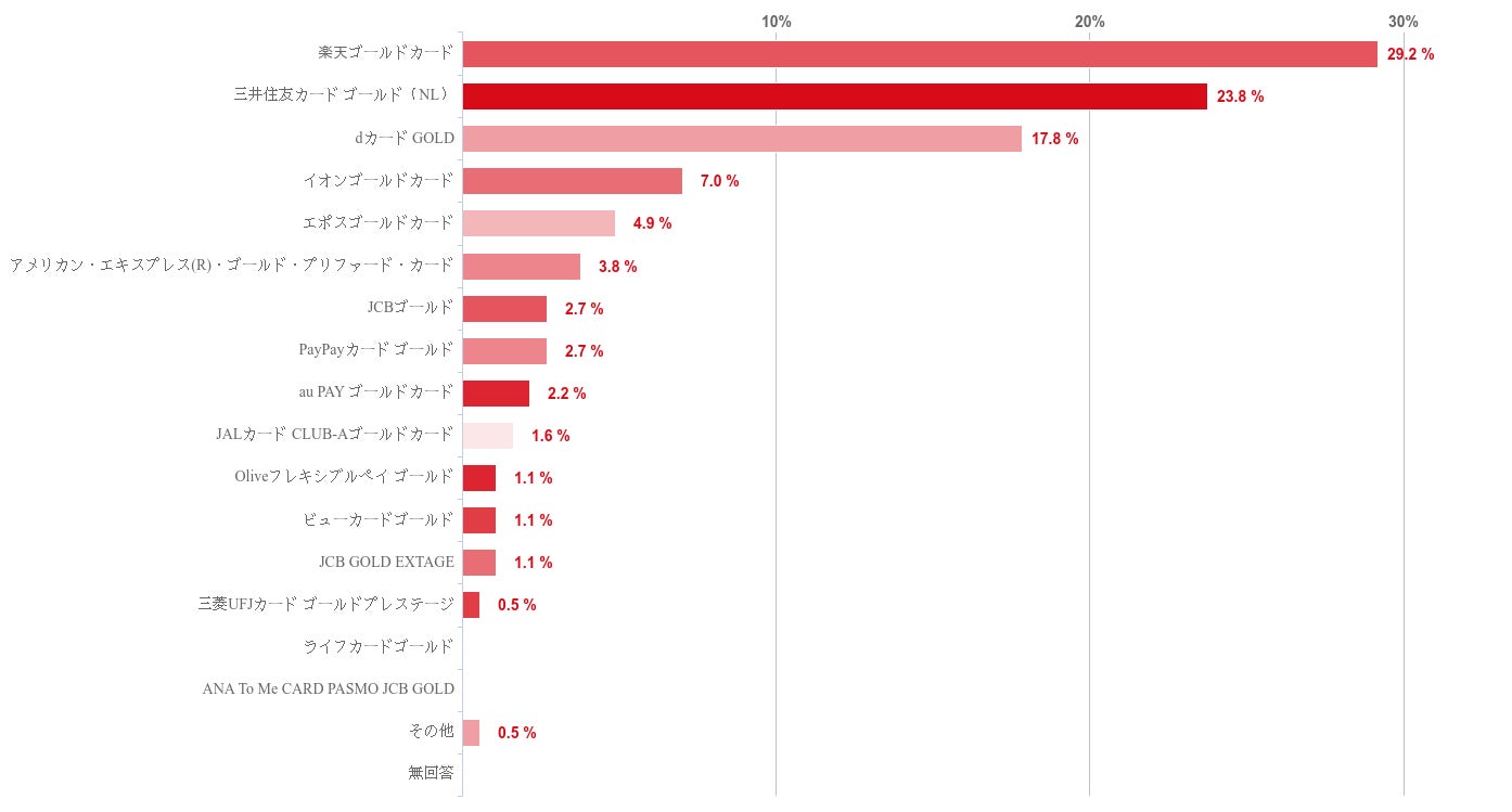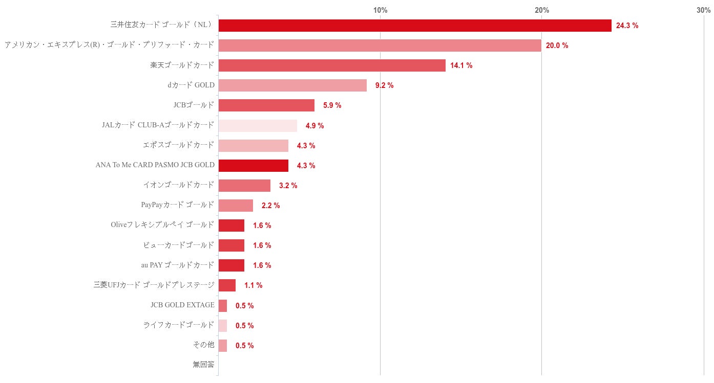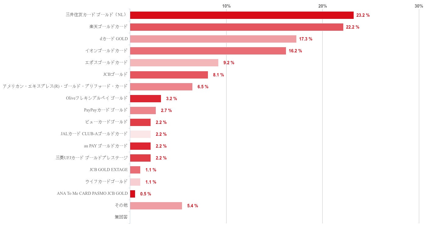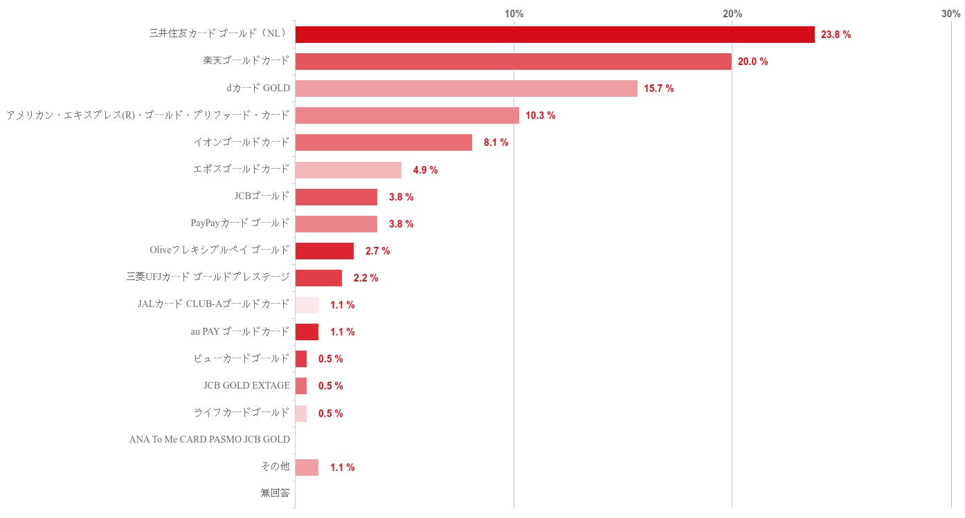 三井住友カードゴールド(NL)が23.8%で最も多く、楽天ゴールドカードが20.0%でこれに続いた。また、dカードGOLDやがアメリカン・エキスプレス(R)・ゴールド・プリファード・カード、イオンゴールドカード等にも一定数の回答があった。