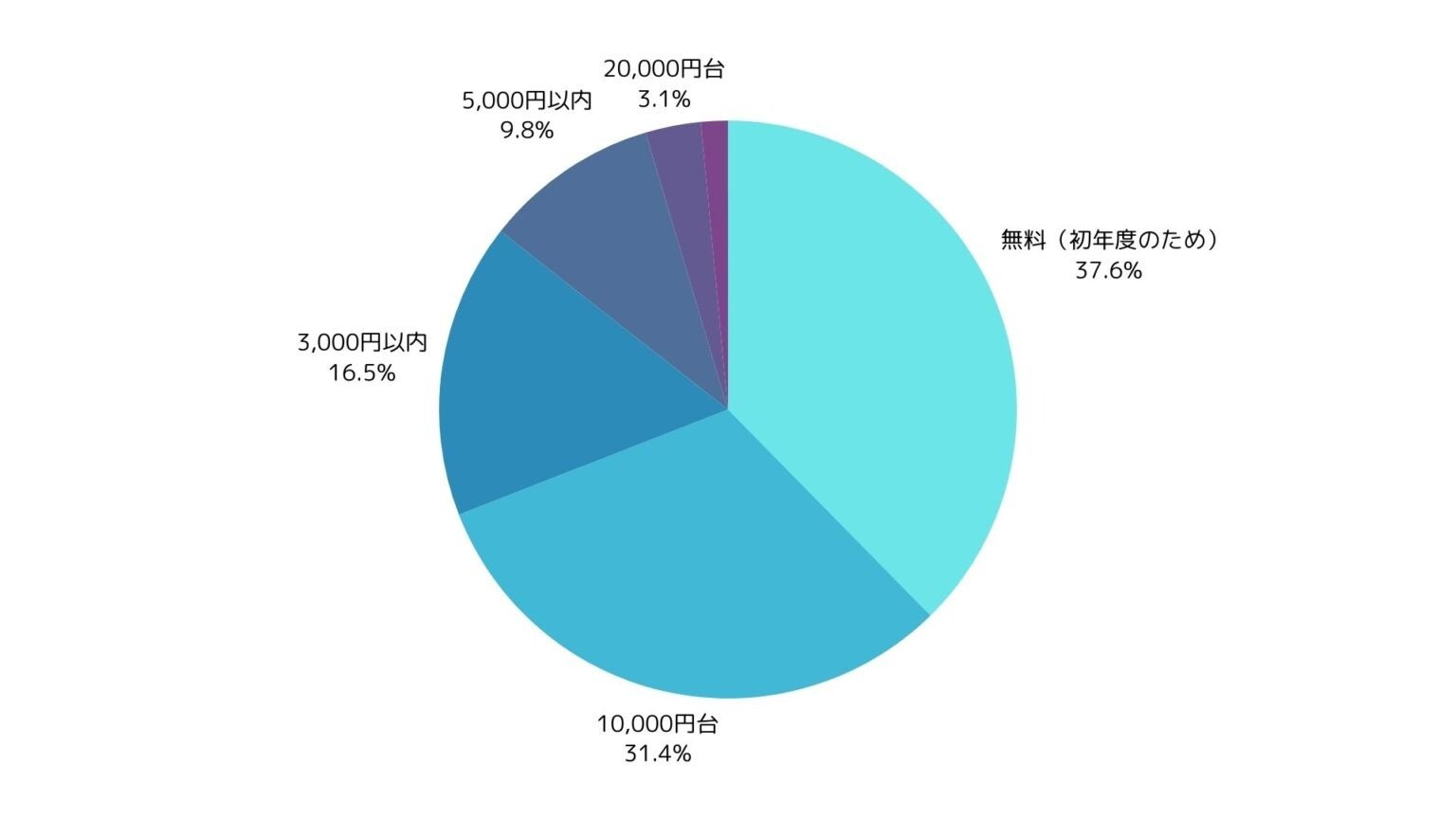 「無料(初年度のため)」が37.6%で最も多かったが、年会費が「10,000円台」という人も31.4%と2番目に多かった。また、わずかだが3万円台の年会費を支払っている人もいた。