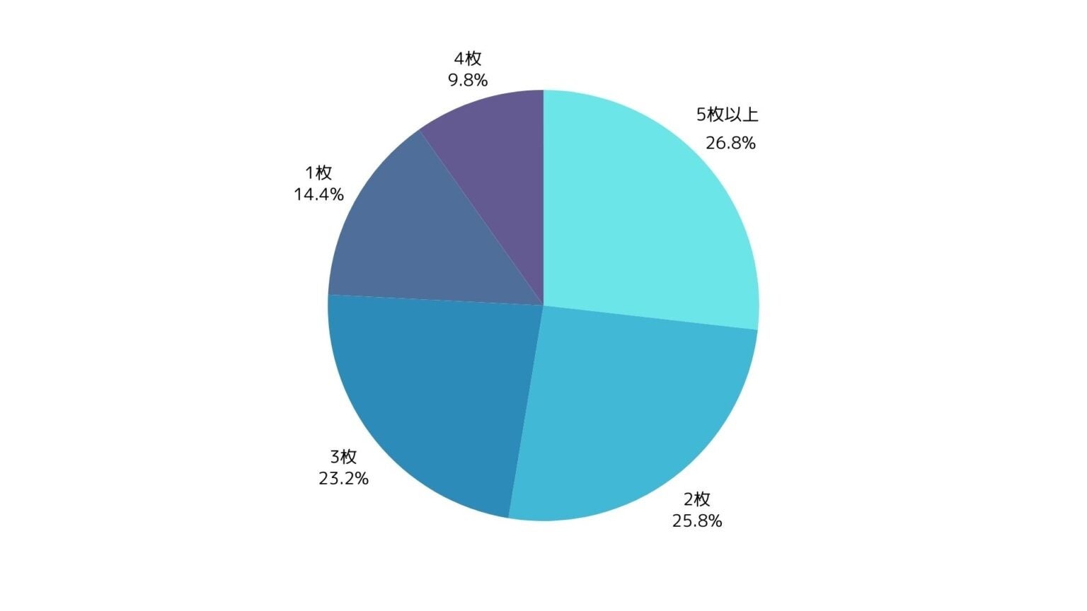「5枚以上」が25.8%で最も多く、「2枚」「3枚」と続いた。また、複数のクレジットカードを持ち合わせている人が全体の約8割にのぼることもわかった。