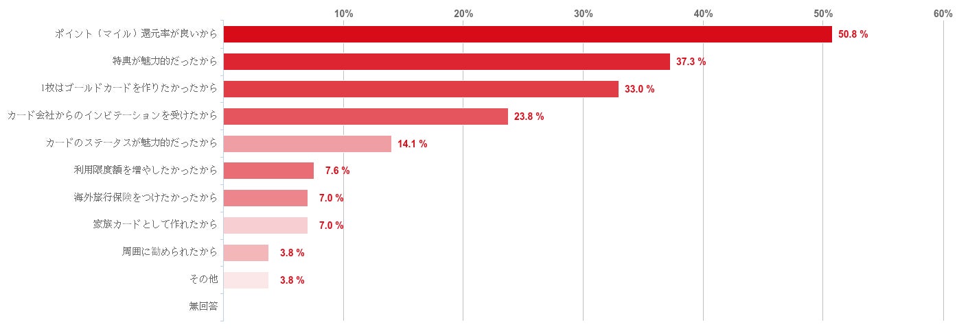 「ポイント(マイル)還元率が良いから」が50.8%で最も多く、これに「特典が魅力的だったから」が37.3%で続いた。また、「1枚はゴールドカードを作りたかったから」という人も33.0%いた。