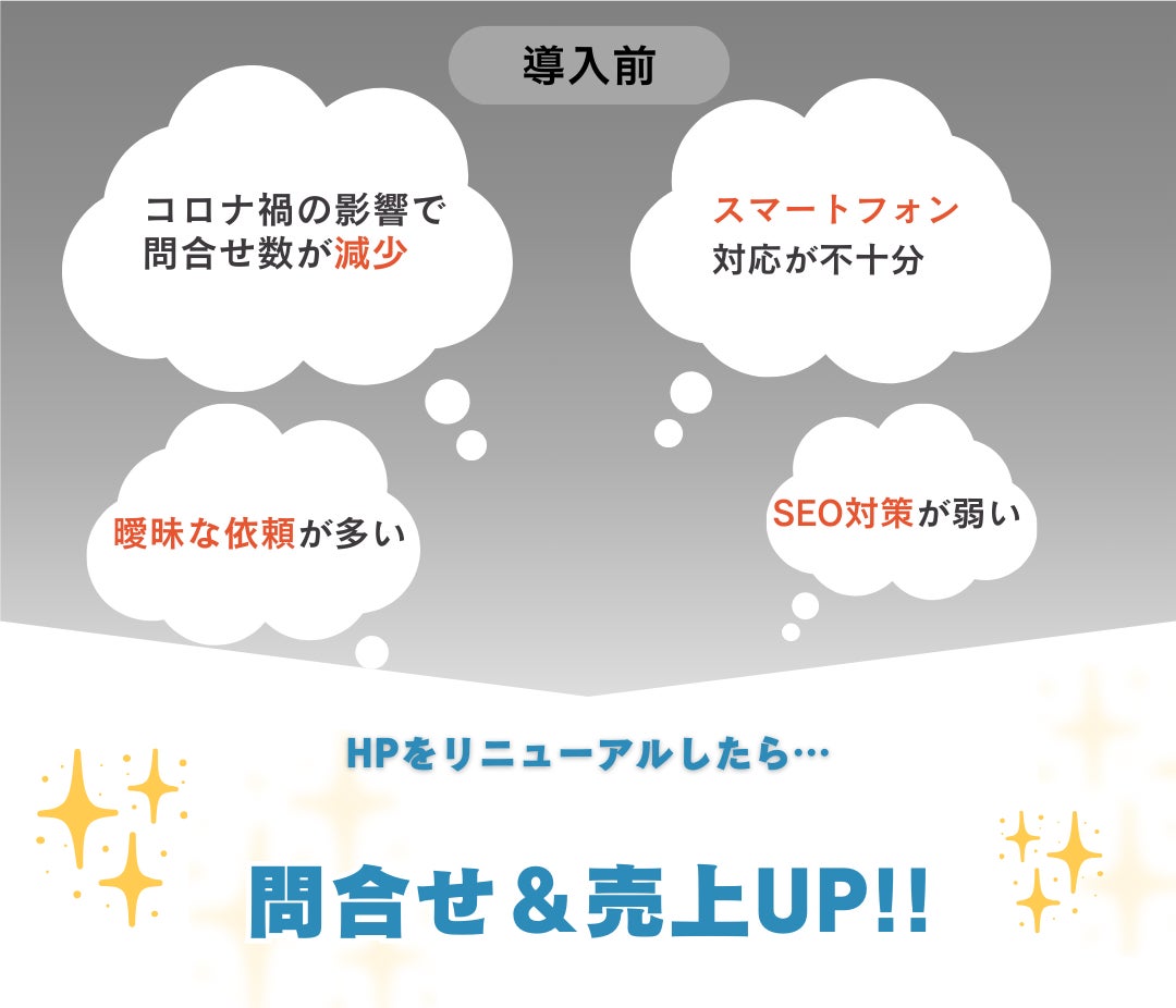 しかし、以前のホームページはスマートフォンに対応しておらず、お問い合わせも月3件程度と伸び悩んでいらっしゃっいました。現代のWEBニーズではスマホ対応していることが必須であるため、導入を決めていただきました。
