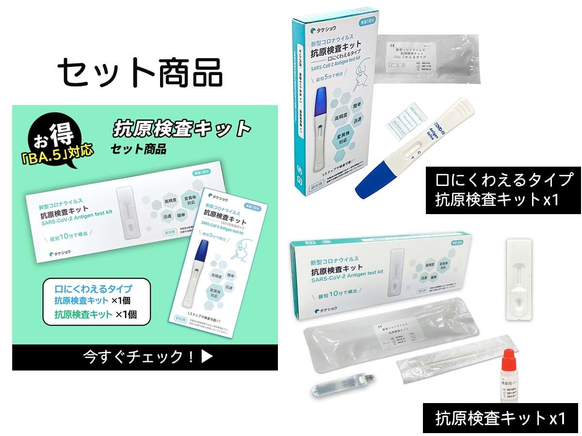 タケショウショップでは、抗原検査キットが2種類各1個ずつ入った新しいセット商品を発売いたしました。個別購入よりお安くご購入いただけますので、この機会にお試しくださいませ。