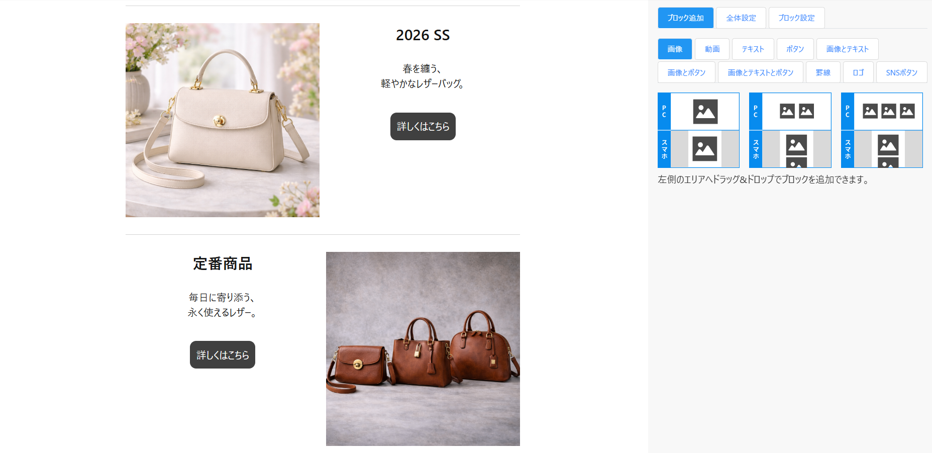 ドラッグ&ドロップ感覚で、動画・画像・ボタンを自由に配置できます。
