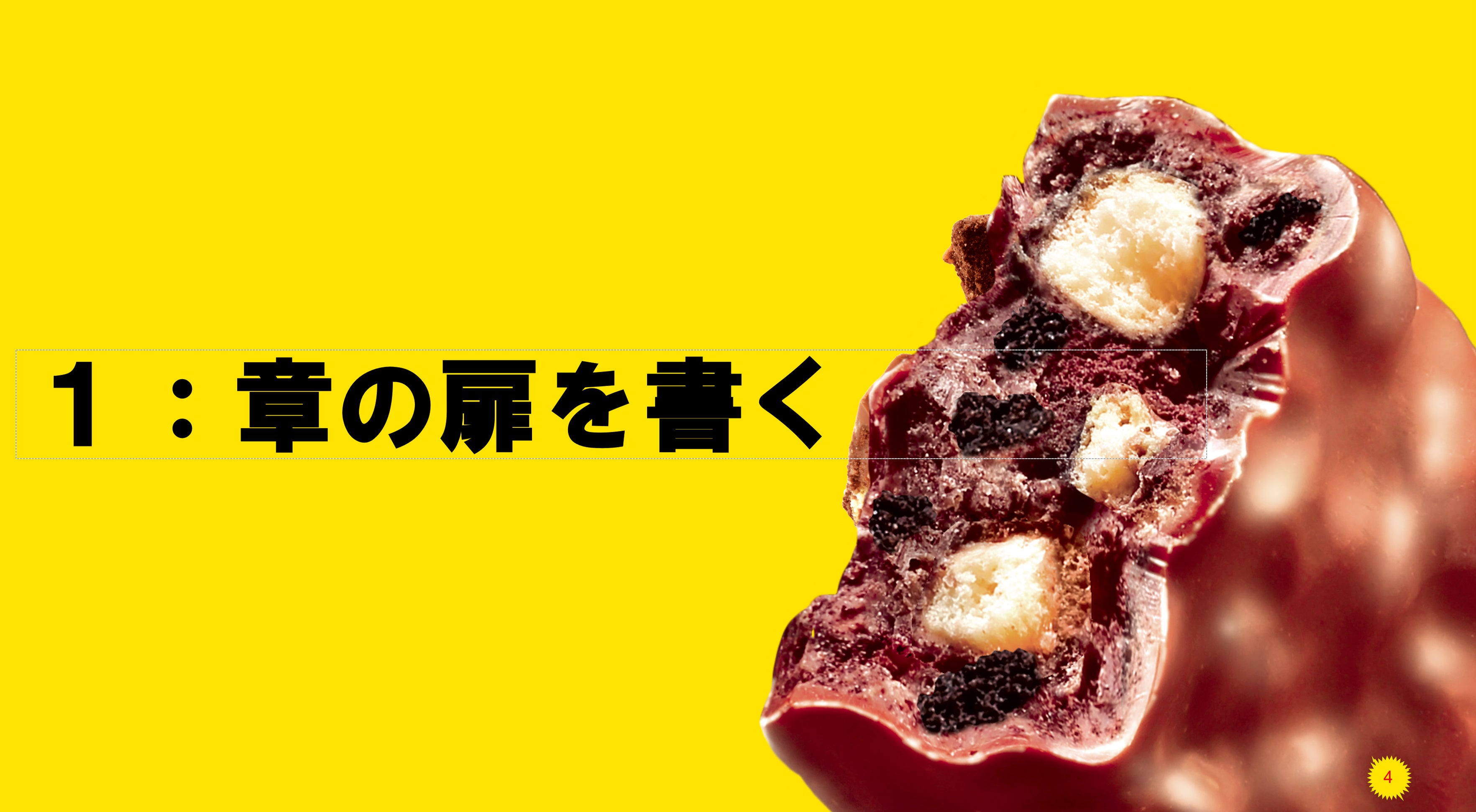 表紙などに出てくるブラックサンダーのお菓子の絵は、パワーポイントにある図形を組み合わせて作られています。図形の総数は50 個に及びます。ブラックサンダーの凹凸や、断面のクッキーやビスケットの質感まで、細部にこだわった高い再現度にぜひご注目ください。