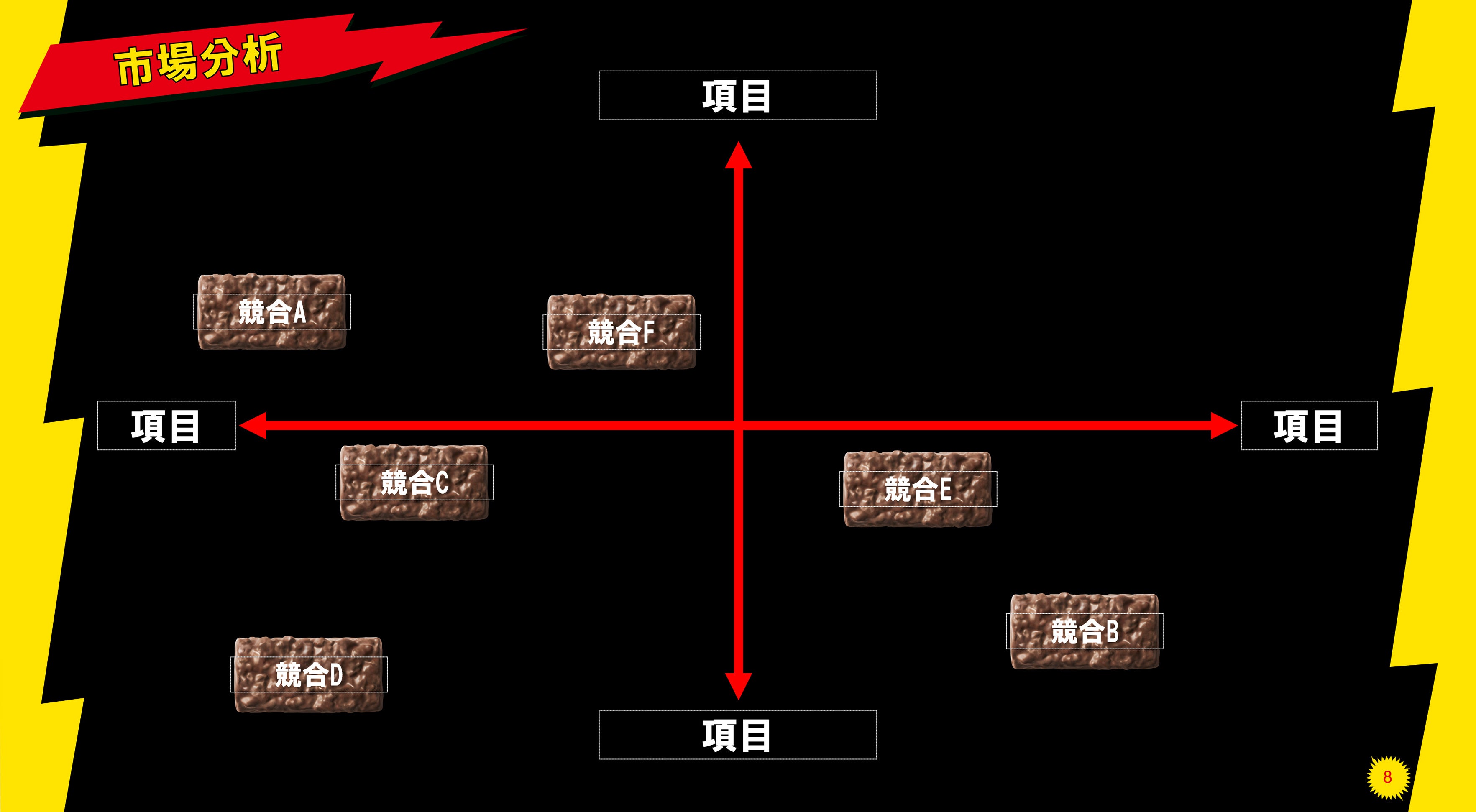 自己紹介ページにご自身の顔写真を挿入すると、ブラックサンダーのセーターを着た自分が語りかけるような形になり、場が盛り上がること間違いなしです。また、これぞという戦略を書くページには、雷のアニメーションを施すことにより、戦略がより印象的に映る工夫をしています。売上推移などのグラフ制作には、ブラックサンダーをグラフ棒としてご利用いただけるページもあり、様々なシーンに合わせてお使いいただけるテンプレートです。