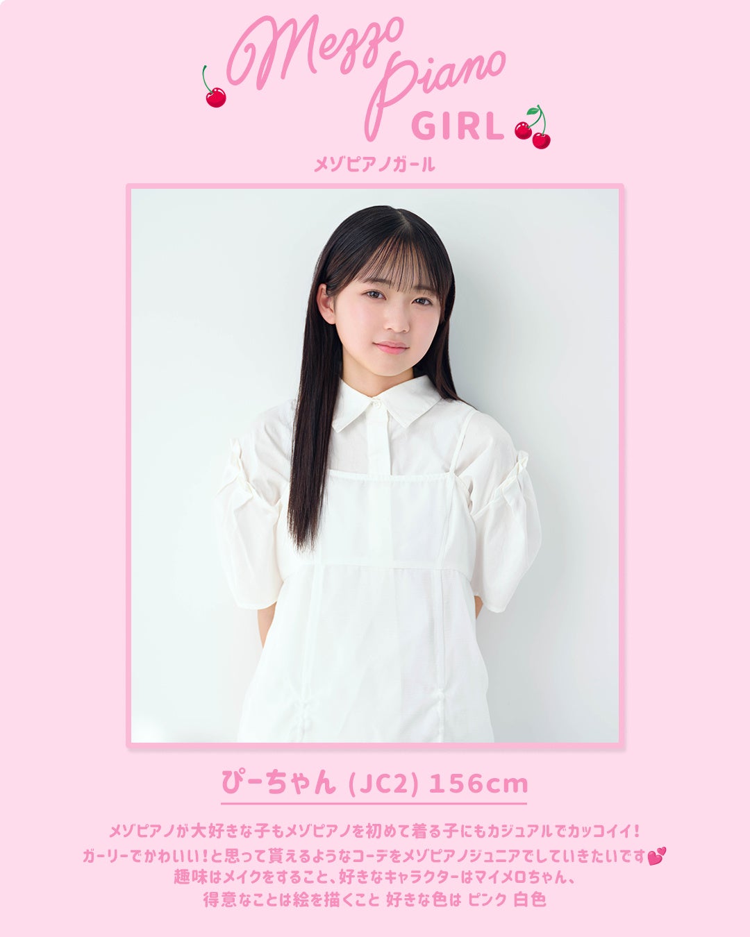 第1期 メゾピアノガールの活動をリードする存在として、小中学生向けファッション誌『Cuugal(キューーガル)』専属モデルであり、2024年秋冬よりメゾピアノ ジュニアのイメージモデルも務めた小日向 希衣(こひなた・きい)ちゃんが、メゾピアノガールスペシャルモデルとして就任!