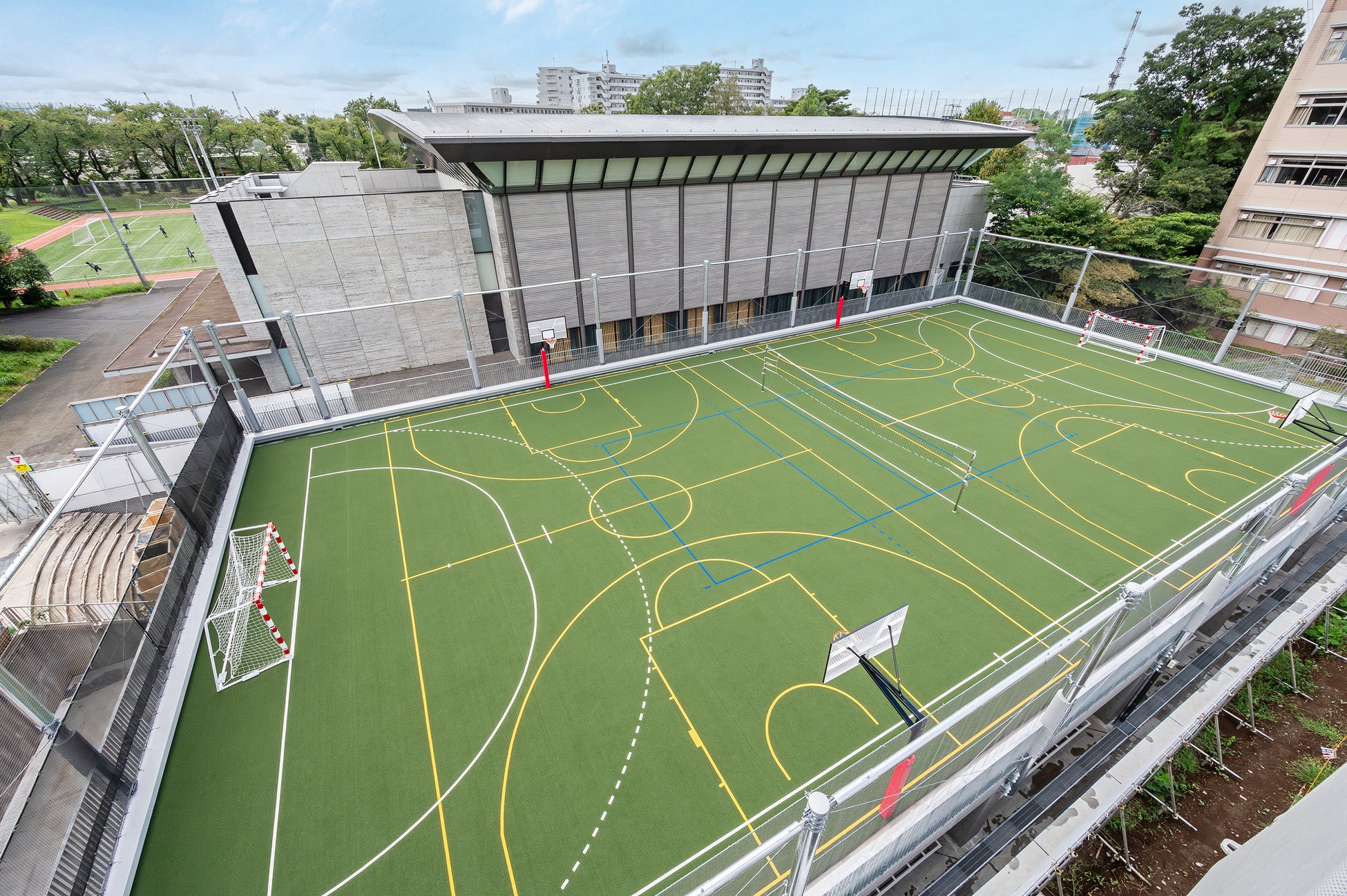 一方、駐輪場付体育施設は、生徒数増加に伴う生徒用駐輪スペース不足への対応と中高共学化による課外活動等の多様化に対応するため、新たに設計・建設しました。新施設は、駐輪場の屋上部分に体育施設を併設する形を採用し、限られた敷地を有効活用しています。屋上には人口芝を敷設し、ハンドボールコート、バレーボールコート、さらに3×3形式のバスケットコートとして利用できる運動スペースを整備しました。これらの新施設を通じて、生徒の学習環境と課外活動の充実を図り、より良い教育の場を提供していきます。