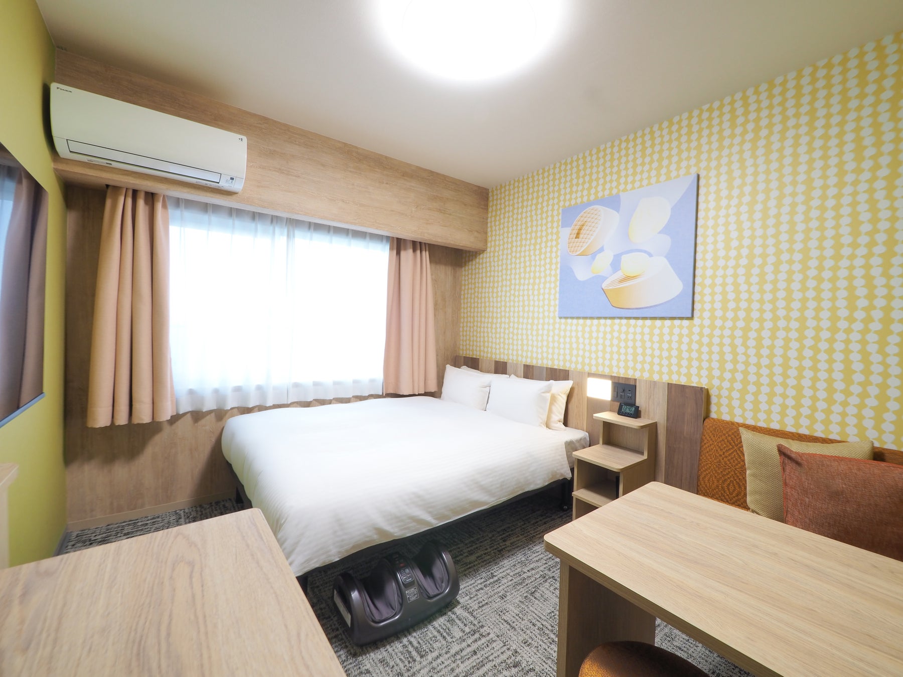 明るくポップなデザインを基調としつつ、木のぬくもりを感じるインテリアを備え、ワクワクとリラックスを共存させる空間を演出しています。壁には大阪をモチーフとしたアートを飾り、その土地の空気を感じられる、温かみのある雰囲気の客室に生まれ変わりました。寝心地の良いサータ社製の快眠ベッド、ゆったりくつろげるソファーとテーブル、加湿空気清浄機のほか、フットマッサージャーやくつ乾燥機を設置しており、旅の疲れを癒し快適にお過ごしいただけます。また、靴を脱いでお寛ぎいただけるファミリールームや和モダンフォースなど、お部屋タイプも充実しています。さらには、50インチ以上の大型スマートTVを導入し、お客様ご自身のアカウントで各種有料コンテンツもお楽しみいただけます。