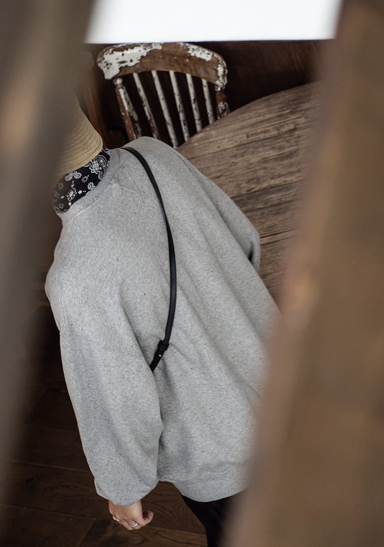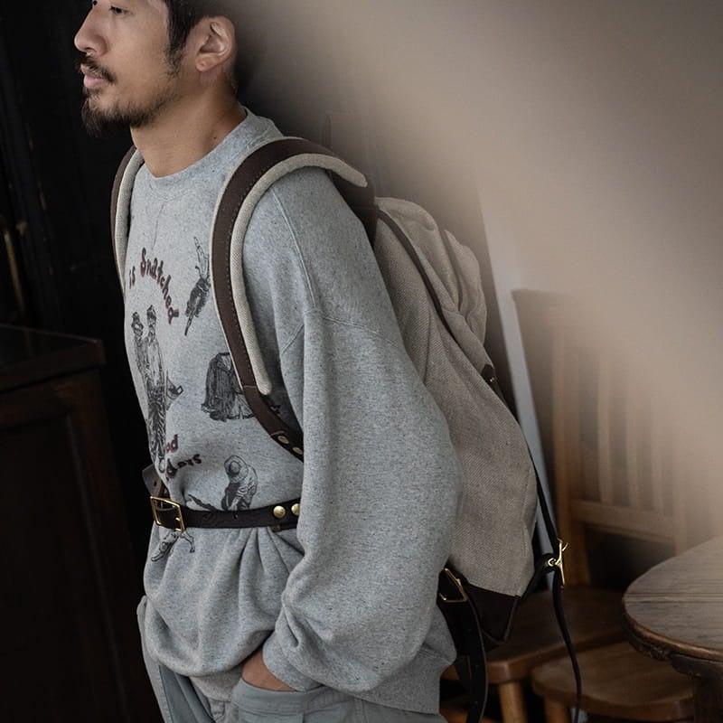 本来処分されていた裁断後の端切れから生まれ変わった反毛糸を使用する、弊社のUpcycleLino定番の裏毛スウェットのボディを採用し、グラフィックをプリント。2024AWシーズンの「時のスーベニア」としてご用意しました。肩幅や身幅の広い、ルーズなシルエットが特徴のスウェットです。
