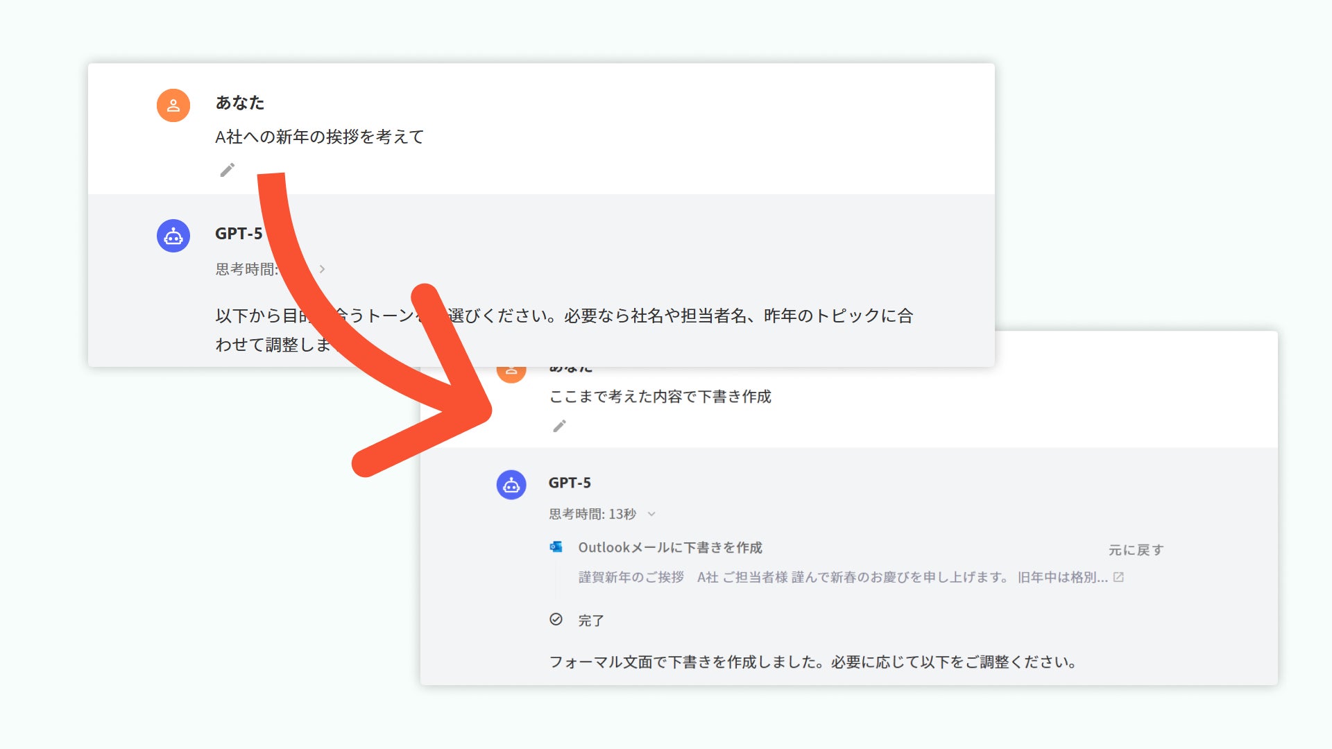 ChatSense上のチャットで指示を出すだけで、Outlookの「下書き」フォルダにメール案を作成します。作成されたメールは勝手に送信されることはありません。ユーザーは生成された下書きをワンクリックで確認・修正し、安心して送信することができます。