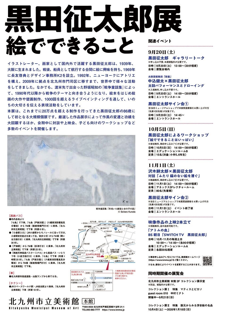 北九州市立美術館本館(北九州市戸畑区西鞘ケ谷町21番1号)では、「黒田征太郎展 絵でできること」を9月20日(土)~11月9日(日)に開催します。絵本をはじめ絵画の大作や壁画、1000回を超えるライブペインティングを通して、いのちの大切さを伝え続けてきた黒田征太郎氏の、86歳にして初めてとなる大規模展覧会です。この機会にぜひ、美術館へ足をお運びください。