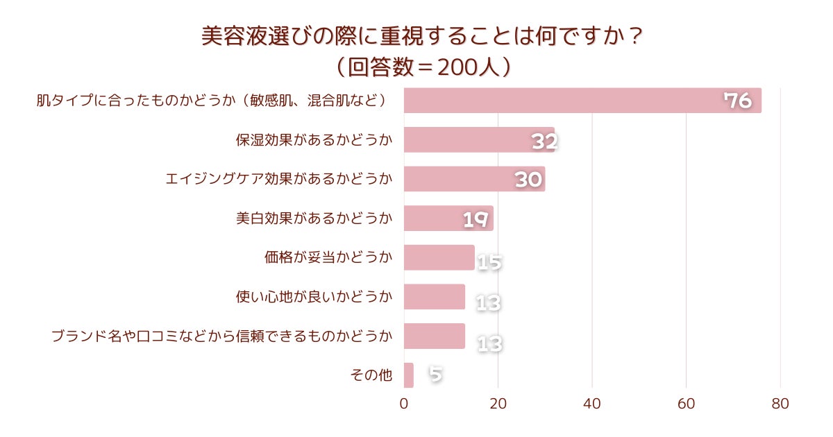 「美容液選びの際に重視することは何ですか?」とアンケート調査した結果、1位は『肌タイプに合ったものかどうか(敏感肌、混合肌など)』でした。