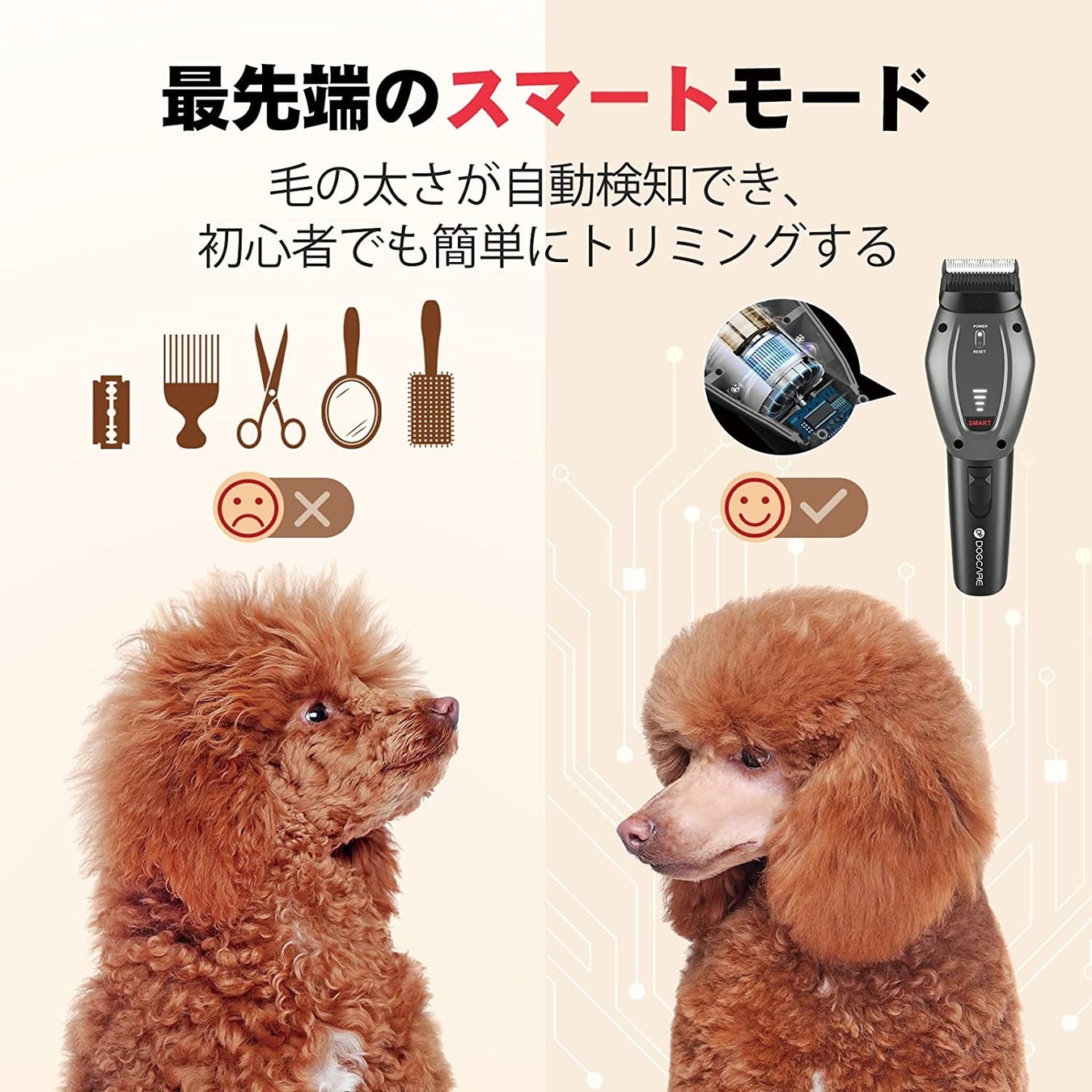 ワンタッチでスピード調整できるDOG CAREペット用バリカンは低回転モードと高回転モードがあります。特にスマートモード付き、犬猫毛の太さが自動検知し、スマートボタンを押すだけで、犬用バリカンは適切な速度を設定しカットでき、初心者でも簡単にトリミングします。
