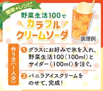 「野菜生活100 あまなつ&オレンジミックス」は、愛媛県産甘夏のすっきりした甘さと、ほのかな苦味に、オレンジの甘酸っぱさを活かした味わいのあるおいしさで、季節のおいしさをお届けする野菜・果実100%ミックスジュースです。砂糖不使用で、1日分※のビタミンCを摂ることができ、家族みんなでおいしくお飲みいただけます。本品を使用した簡単アレンジで、サイダーとバニラアイスクリームを使った「カラフルクリームソーダ」をおすすめしています。※ 栄養素等表示基準値(2015)に基づく。