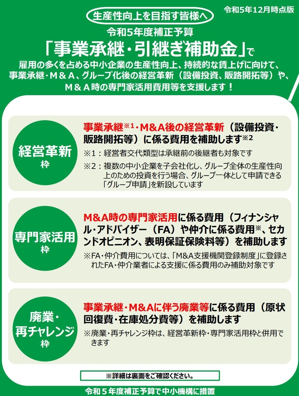 雇⽤の多くを占める中⼩企業の⽣産性向上、持続的な賃上げに向けて、 事業承継・M&A、グループ化後の経営⾰新(設備投資、販路開拓等)や、 M&A時の専⾨家活⽤費⽤等を⽀援する制度。