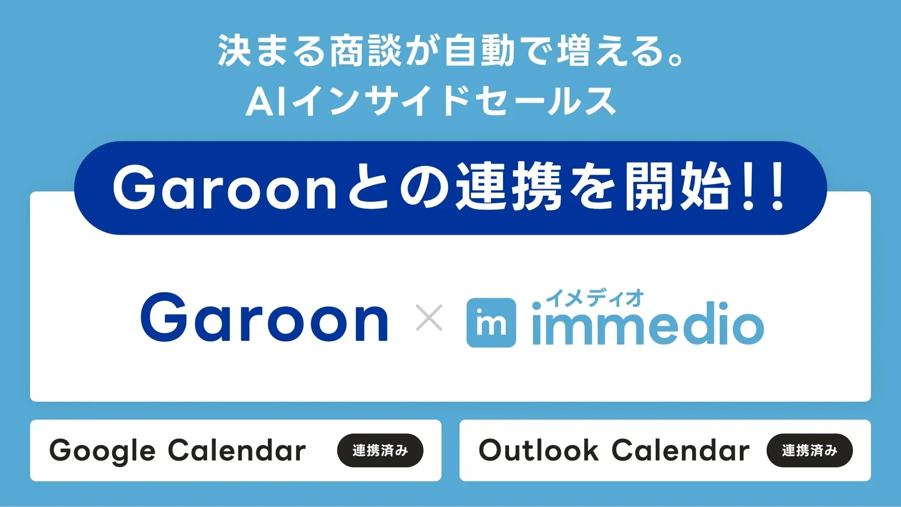 株式会社immedio(本社:東京都港区、代表取締役:浜田 英揮)は、「決まる商談が自動で増える」AIインサイドセールス「immedio」において、サイボウズ株式会社が提供する中堅・大規模組織向けグループウェア「クラウド版 Garoon(ガルーン)」との連携を開始したことをお知らせいたします。