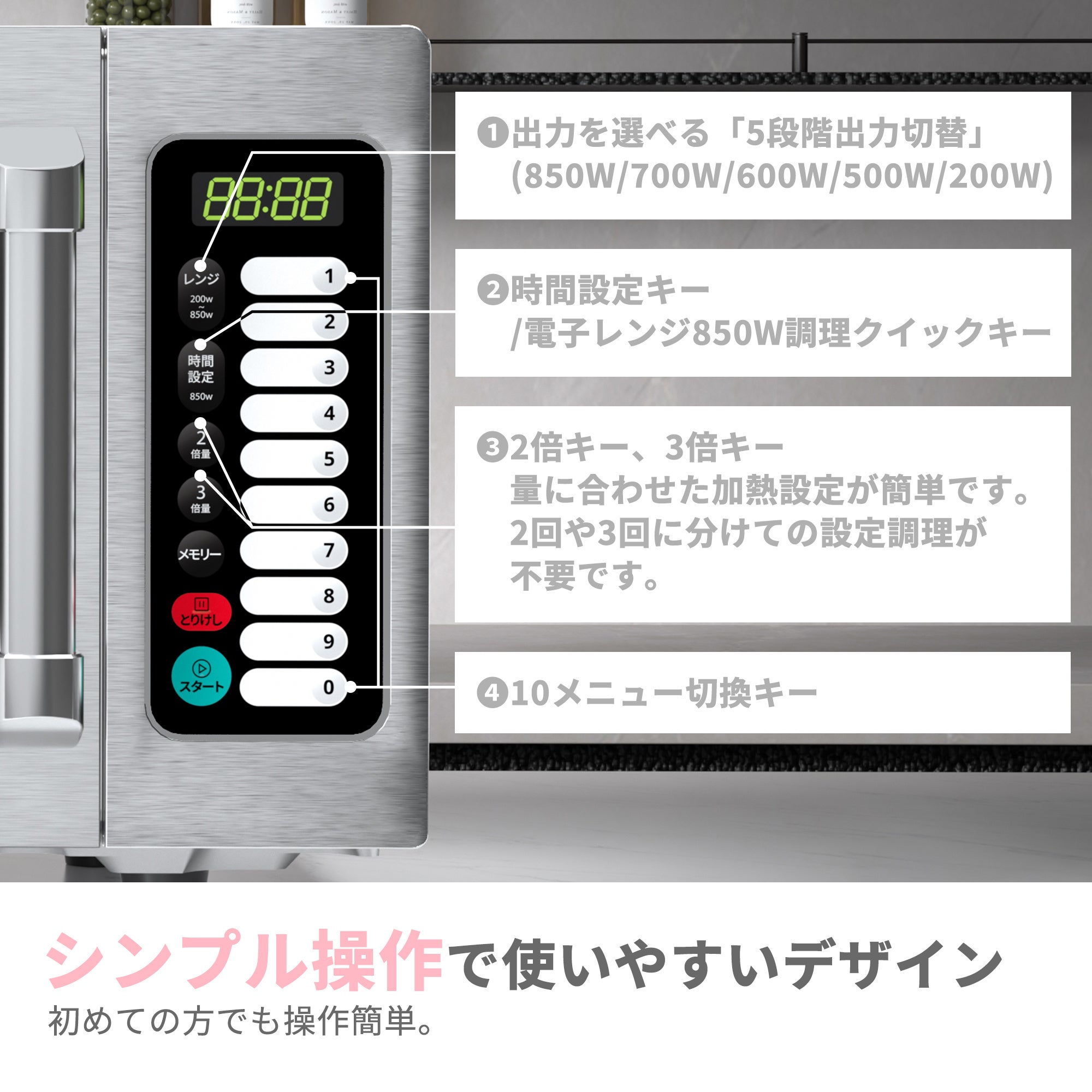 朝のラッシュ時や夕食のピーク、何度も同じメニューを温める場合、設定を毎回調整するのは手間です。Comfee’ CF-EF251-SSの10パターンメモリー機能がこの悩みを一掃!よく使う惣菜、弁当、飲み物などの加熱時間や火力(850W~200W相当の5段階出力)を最大10種類まで事前に登録しておけば、後は対応する数字キーを押すだけで自動調理がスタート!さらに2倍・3倍分量加熱機能も搭載しているため、同じ食材を複数個同時に温める際も、分けて設定する手間が省けます。スタッフが経験に頼る必要がなく、誰が操作しても均一な品質を提供でき、新人トレーニング時間も大幅短縮できます!