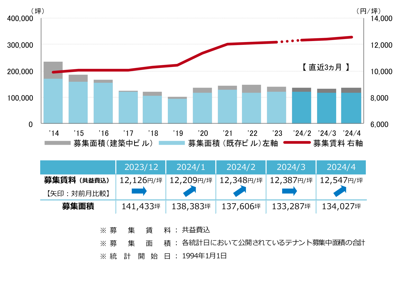 募集賃料は前月比プラス160円/坪の12,547円/坪となった。小幅な上昇が5ヵ月連続しているものの、オーナー側が募集条件を見直す動きは広がっていない。