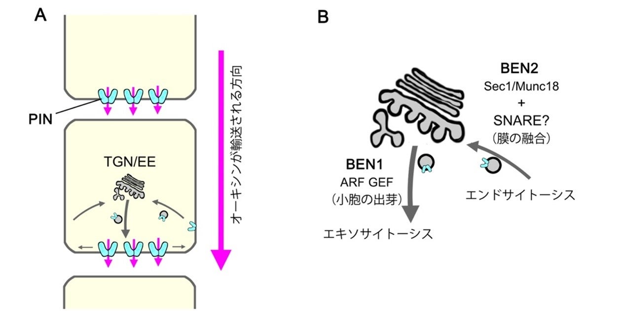 植物ホルモンの一種であるオーキシンは、PIN タンパク質などの排出輸送体により細胞の中から外に汲み出され、AUX1などの流入輸送体により細胞の中に取り込まれることがわかっています。PIN1やPIN2などのタンパク質は、細胞膜の一部の領域に偏って分布することで、細胞の特定の方向にオーキシンを汲み出し、組織の中でのオーキシンの極性輸送に貢献していると考えられています。これまでの研究により、PINタンパク質は細胞膜に安定に存在しているのではなく、エンドサイトーシスとエキソサイトーシス(細胞膜へのリサイクリング)を繰り返すことで細胞膜での偏りを保ったり、状況に応じて異なる細胞膜領域に移動すると考えられていました(図1)。田中准教授らはこれまでに、蛍光イメージングを活用したスクリーニングによりPINタンパク質の細胞内での小胞輸送が異常になったシロイヌナズナの変異体 ben1 と ben2 を単離していました。また、ben1変異体の異常の原因となっている遺伝子は低分子Gタンパク質の活性制御を担うARF GEF の1つであるMIN7/BIG5 をコードしており、ben2 変異体の原因遺伝子は Sec1/Munc18 ファミリーのタンパク質の一種である VPS45 をコードすることを見出していました。さらに、VPS45はトランスゴルジ網 (TGN) に局在するSYP4グループのSNARE タンパク質と相互作用すること、ben2変異によりその相互作用が弱まることも明らかにしていました。BEN1/MIN7/BIG5 とBEN2/VPS45 はどちらもTGNに分布する膜交通因子であることや、変異体の細胞レベルの表現型などから、BEN1/MIN7/BIG5 はTGNからの小胞の出芽に、BEN2/VPS45 はTGNへの膜の融合に関わることで、PIN タンパク質の細胞内輸送に関わっていると推測されていました。また、BEN2/VPS45は SYP4 SNARE タンパク質の制御を介して働くことが示唆されていました。田中准教授らのグループはben1;ben2 二重変異体は主根が短く、子葉の維管束が不連続になるなどのオーキシンに関連する異常を示すことが明らかにしていました。一方、SYP4ファミリーには3つのメンバー (SYP41、SYP42、SYP43)があり、植村教授らのグループはsyp42;43 二重変異体や syp42;syp43;syp41/+ 個体では個体の成長が阻害されることや病原菌応答に異常が見られることを明らかにしていました。しかし、植物の発生の制御におけるVPS45とSYP4の関係性については明らかにされていませんでした。また、SYP4が PIN タンパク質の局在制御やオーキシン依存的な発生制御においてどのような役割を担っているのかも不明でした。