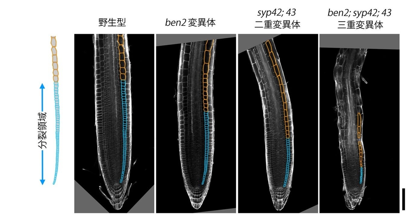 野生型植物の根の先端には活発に細胞分裂を行う小さい細胞の集団(分裂領域)が見られる。3つの SYP4 遺伝子のうちの2つの機能を失った syp42; 43 二重変異体や、さらに VPS45 の機能も弱まった ben2; syp42; 43 三重変異体では分裂領域が狭まっている。スケールバーは 100 µm を示す。