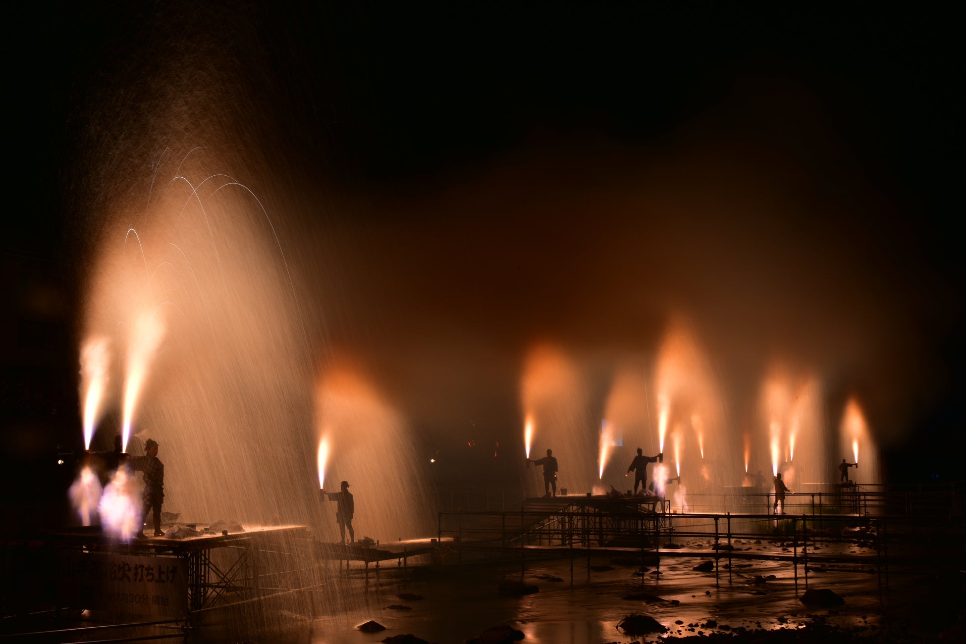 毎年8月9日("厄"(や・く)の日にちなむ)に開催される「飛騨高山手筒花火打上げ」は、飛騨高山サマーフェスティバル推進協議会主催による夏の伝統行事です。宮川の川床に仮設台を設置し、総勢約40名の手筒組が竹筒を抱えて火の粉を浴びながら打ち上げます。火柱は8〜10mに達し、打ち上げの後には轟音が響く迫力満点の演出とともに、参加者・観覧者の厄払いを祈念します。