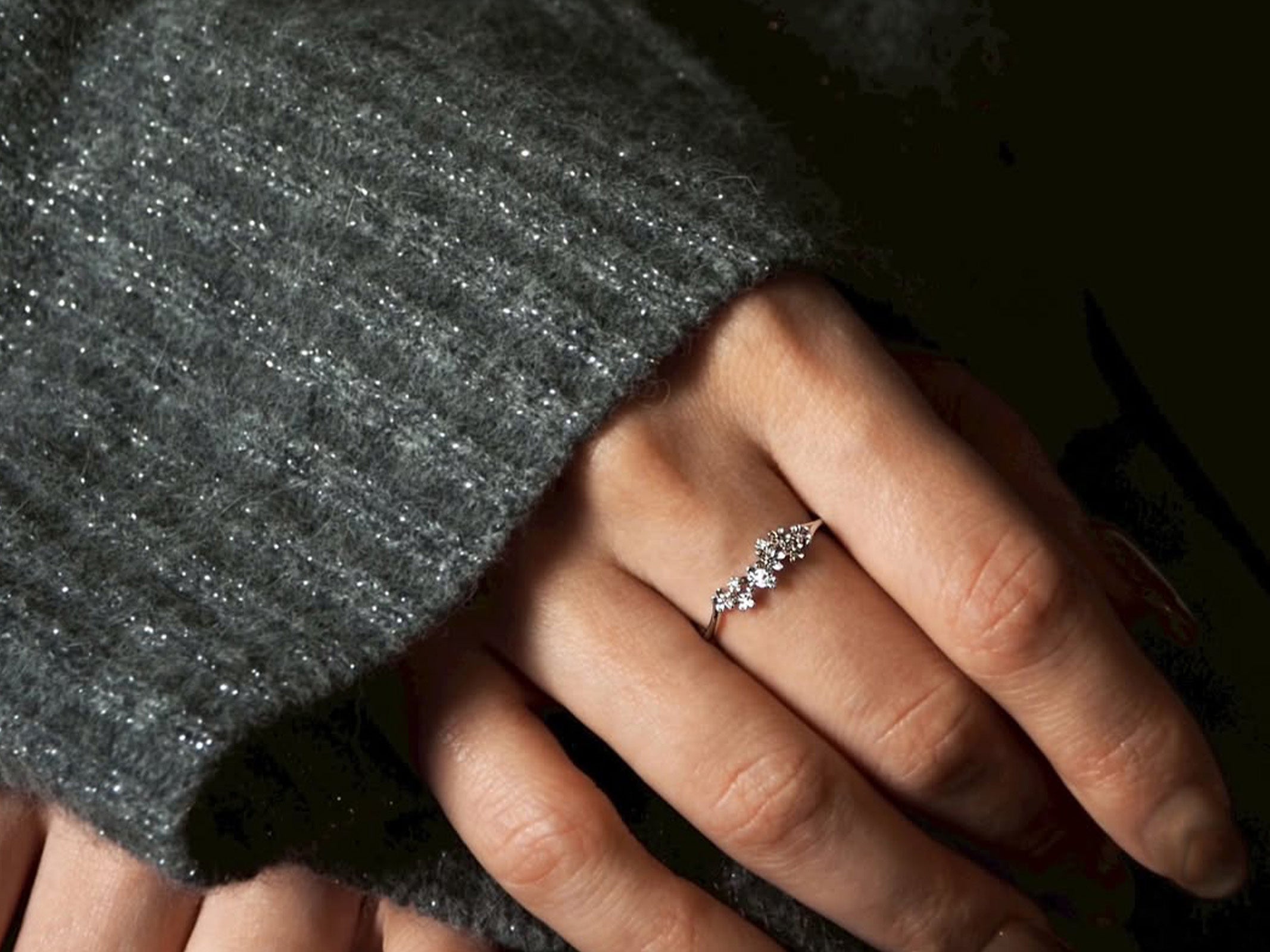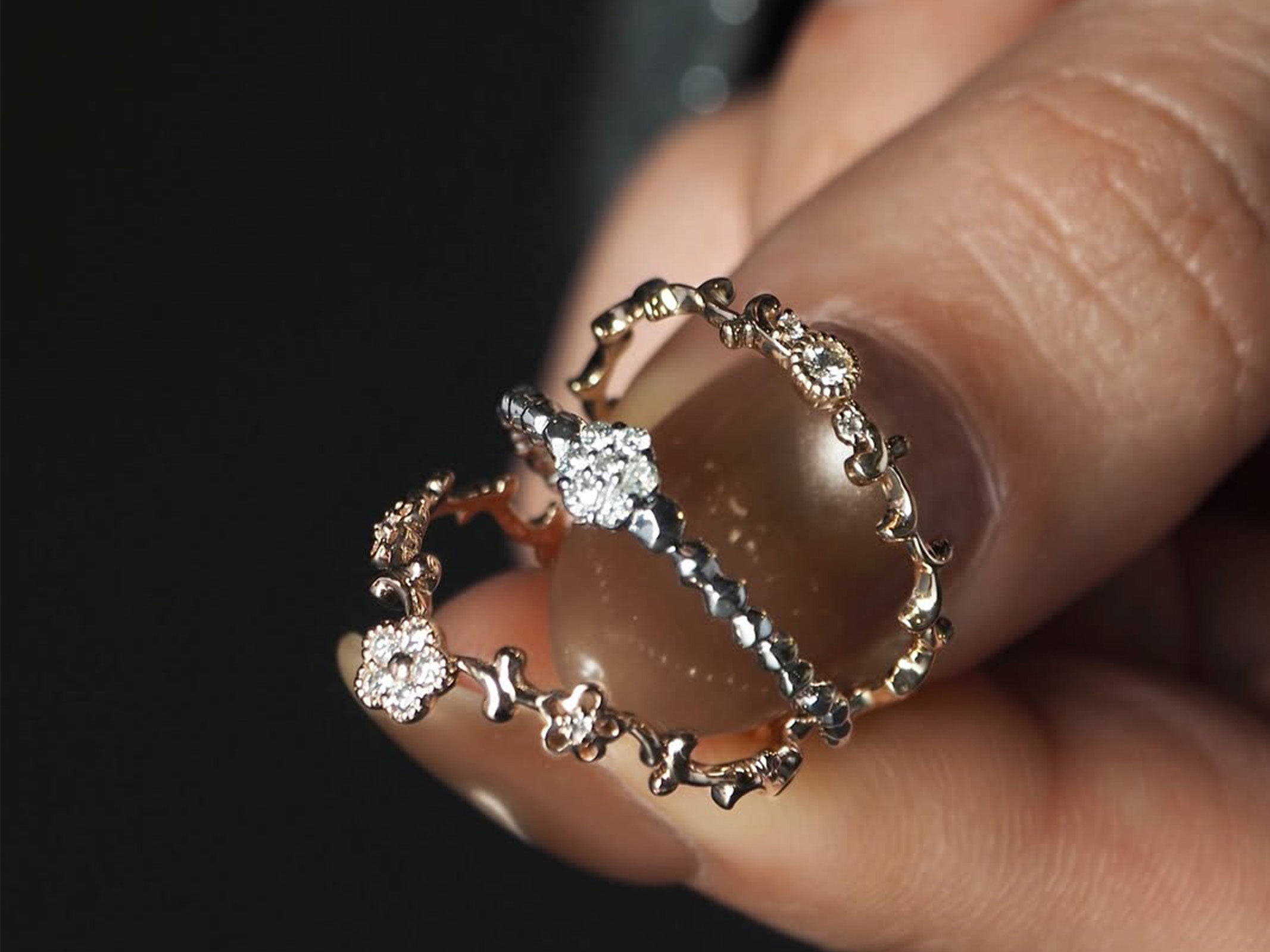 軽やかな葉や植物のモチーフには、澄んだ輝きをもつホワイトゴールドを。エッジに光が宿り、輪郭がすっと立ち上がります。