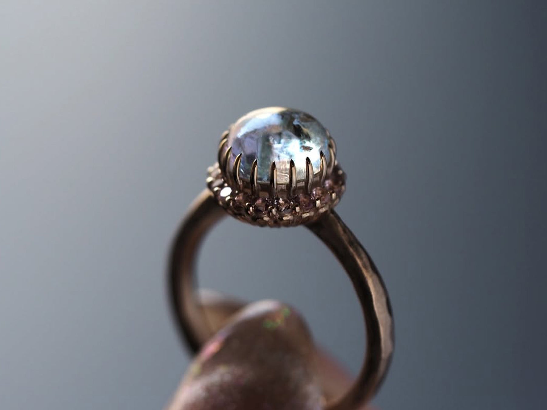 カボションの静かな艶、チェスカットの反射、ファセットのきらめき。センターストーンのカットが変わることで、同じ意匠であっても印象は大きく異なります。