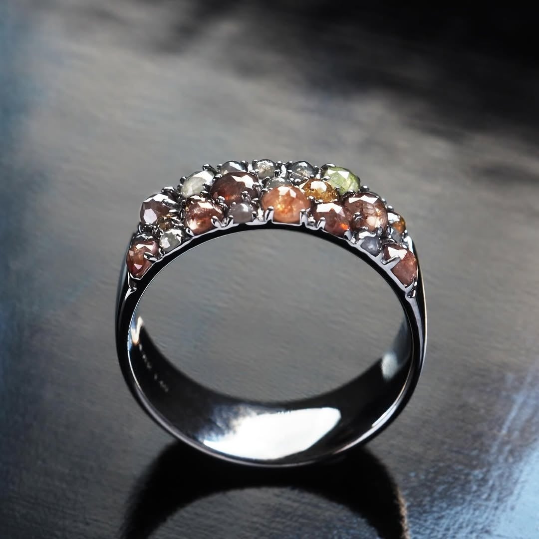 石を密に配したおつくりと、地金の厚みがもたらす立体感。シルバーだからこそ実現できた量感と色彩の対比が、指先に確かな存在を生み出します。