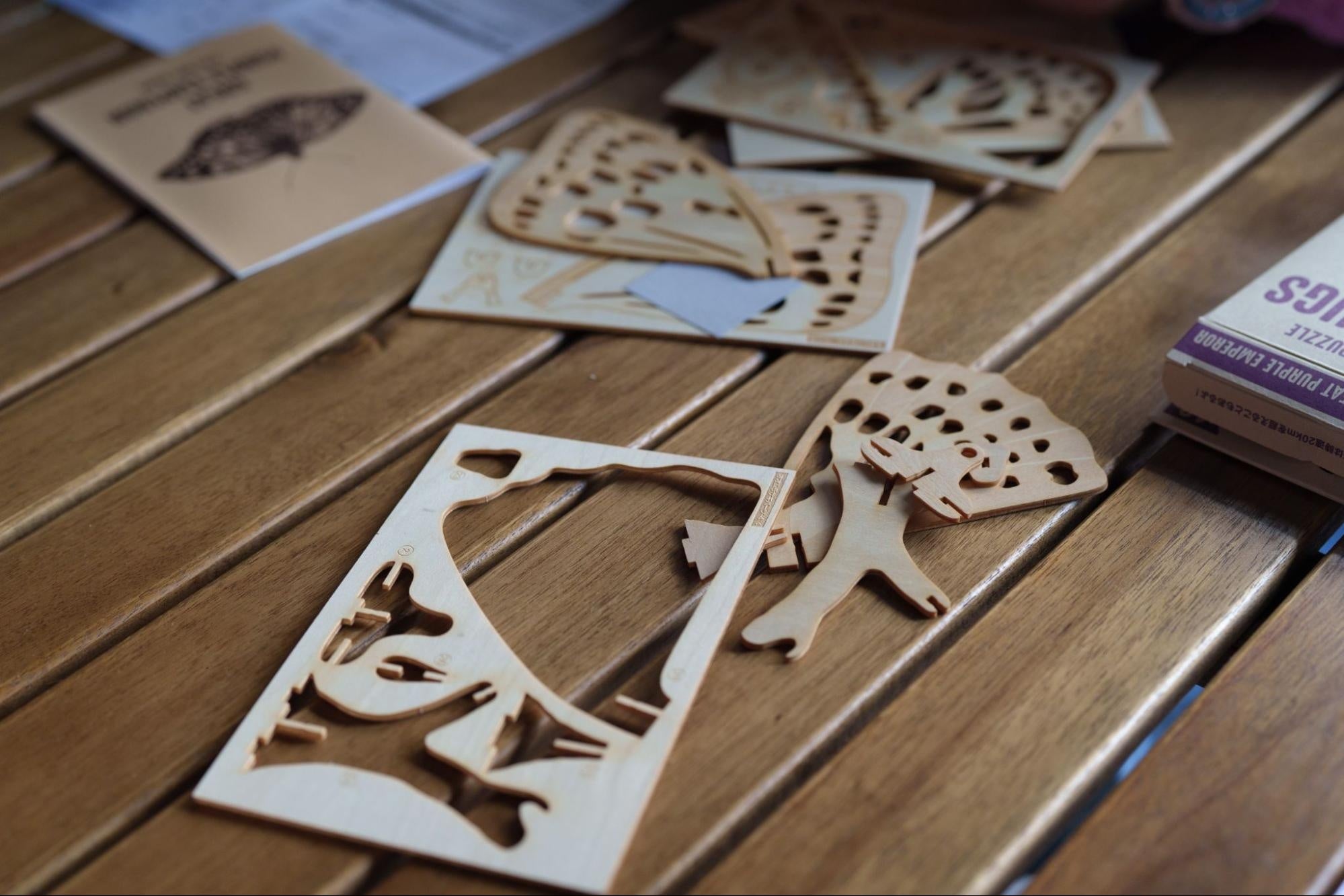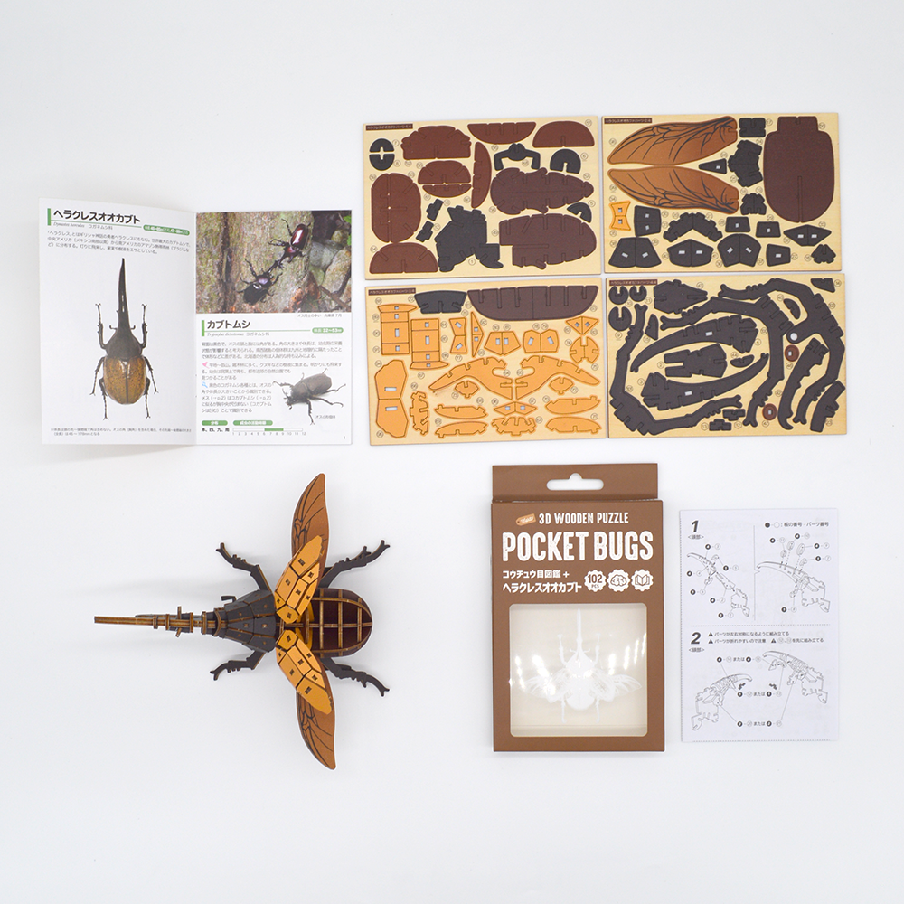 虫と触れ合う機会が少なくなった現代に、虫のおもしろさに触れて興味を持ってもらいたいとの思いから生まれた「ポケットバグズ」は、本物の虫さながらのリアルなウッドパズル。知的好奇心を満たすミニ図鑑も付いています。