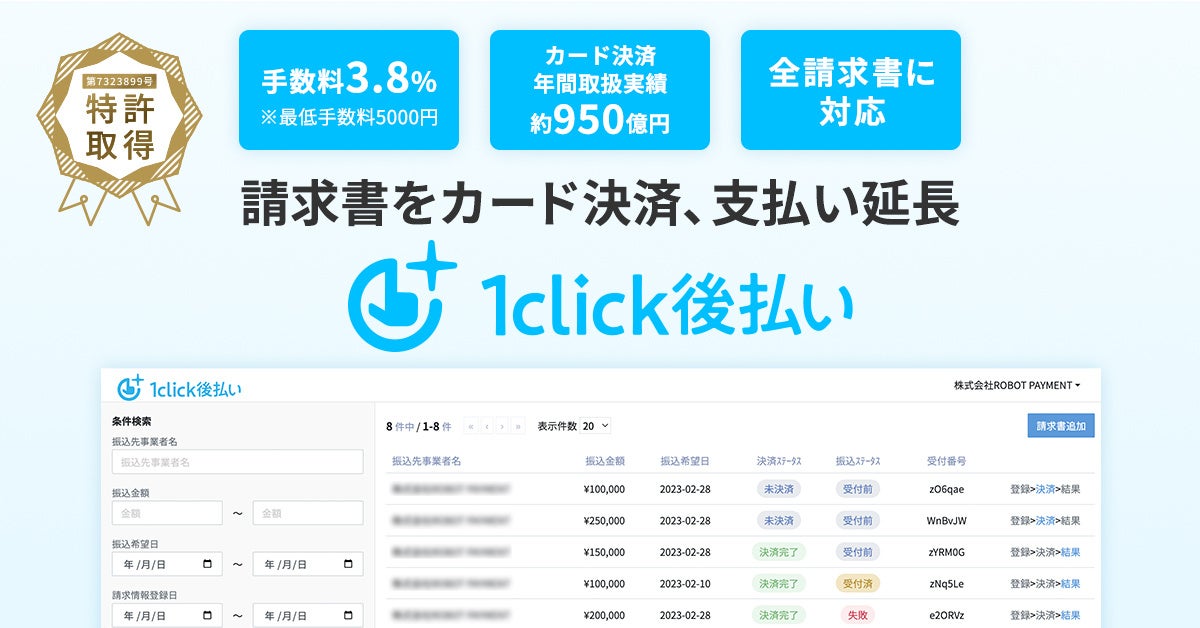 ROBOT PAYMENT、請求書カード払いサービス「1click後払い」にて特許を取得