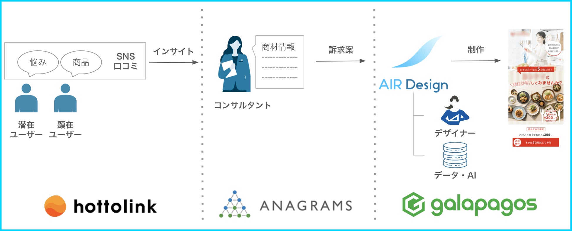 さらに、広告配信後も、集客するまで成果がわからないという条件も加わり、改善施策の重要性を認識しつつも十分にトライできていない担当者も少なくありません。そのような現状を受け、アナグラム株式会社、株式会社ガラパゴスと共同で、ランディングページのクリエイティブ制作支援を開始しました。