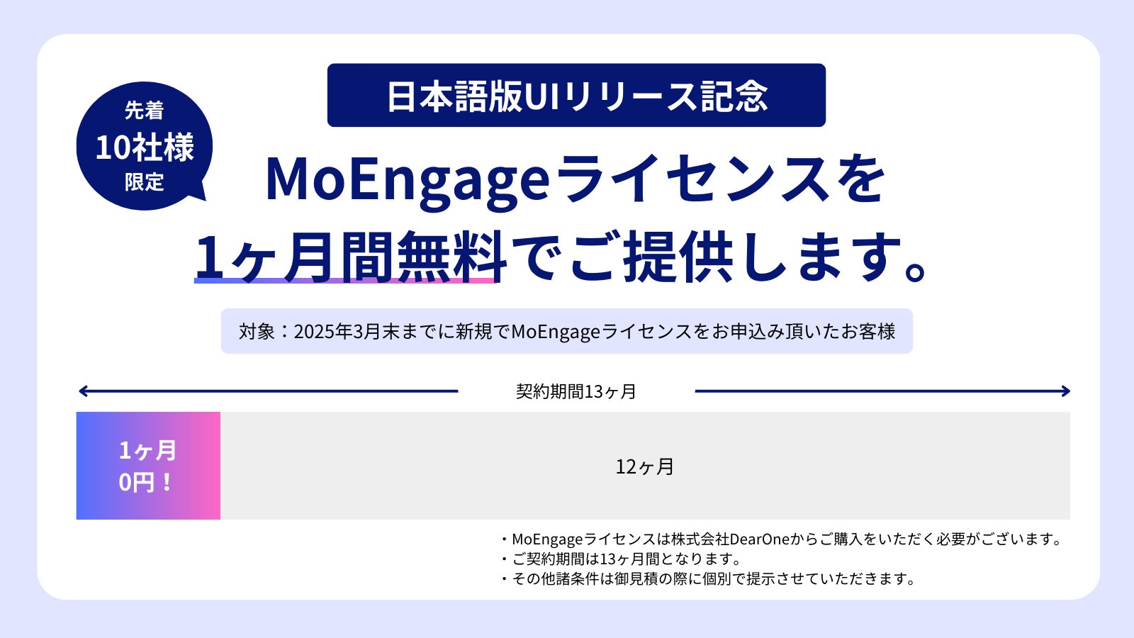 この度、MoEngageの日本語版UIのリリースを記念し、年間契約でライセンスをご購入いただいた先着10社様対象に、、MoEngageのライセンス料が1か月間無料となる特別キャンペーンを実施します。