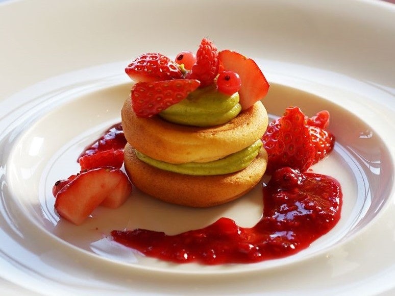 ピスタチオクリームとたっぷり苺とベリーソースのパンケーキに、ホワイトチョコと柚子のムースを、お客様ご自身に絞って仕上げていただきます。チョコレートアイスをアクセントにお召し上がりください。