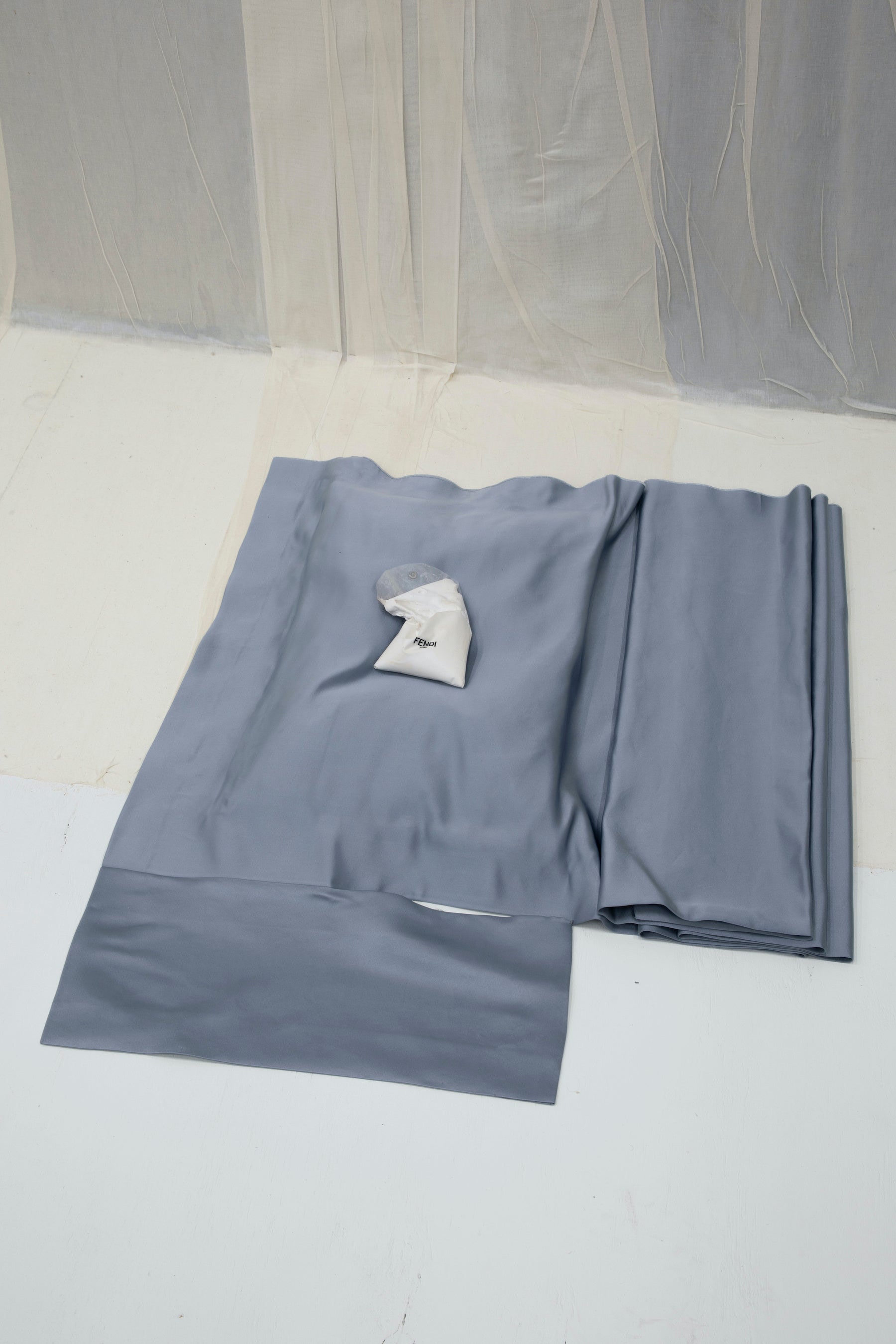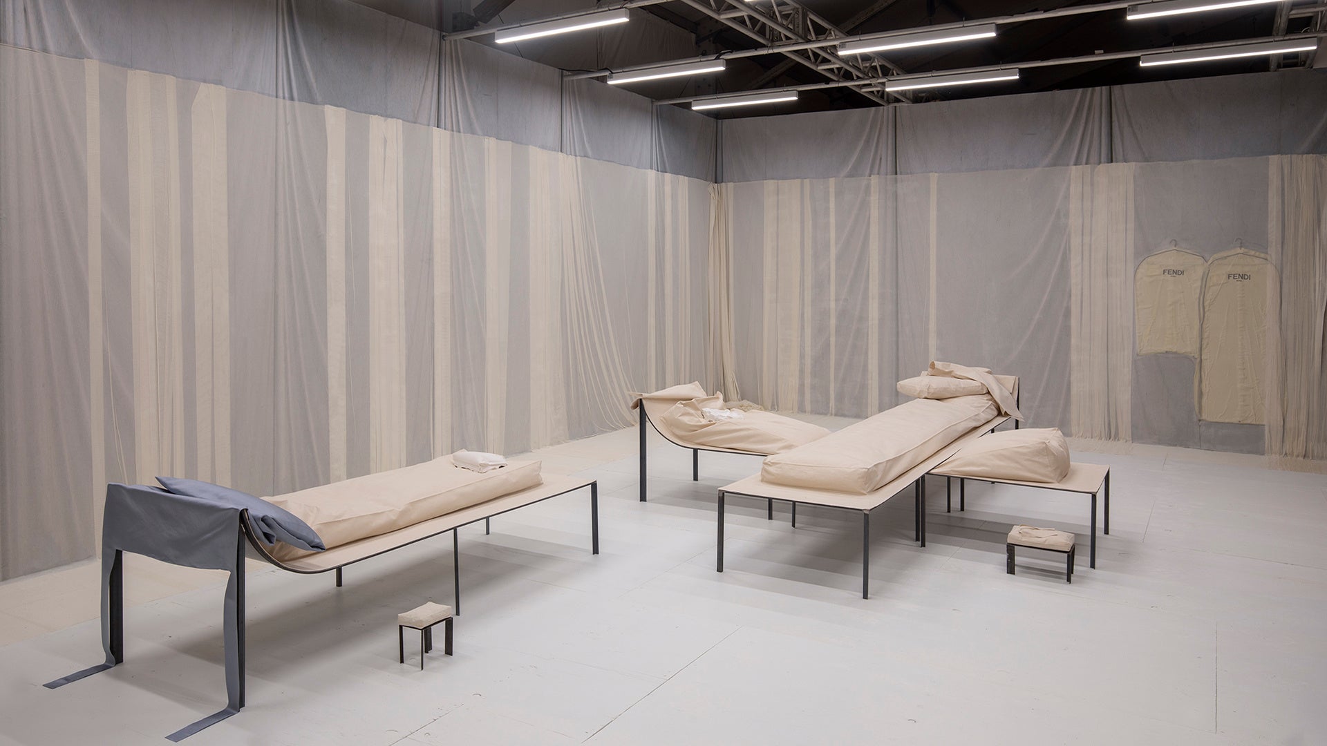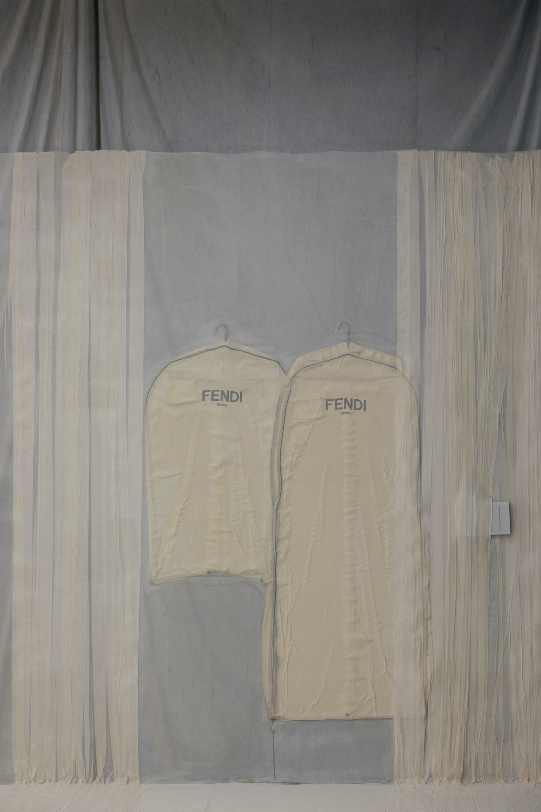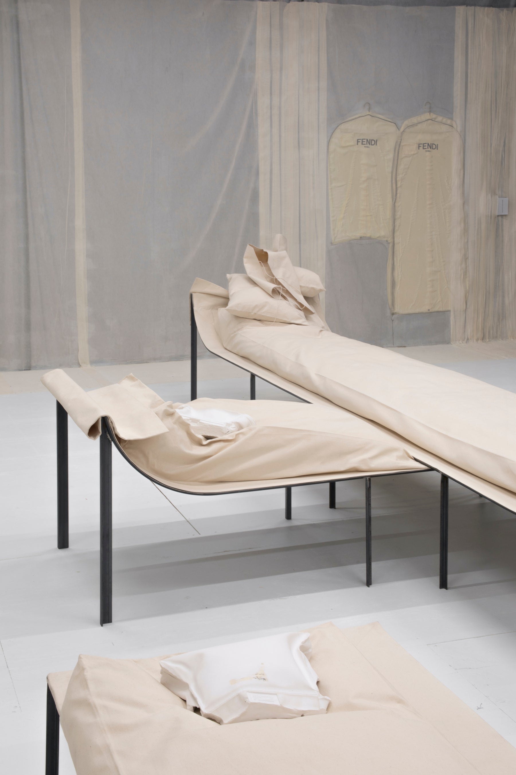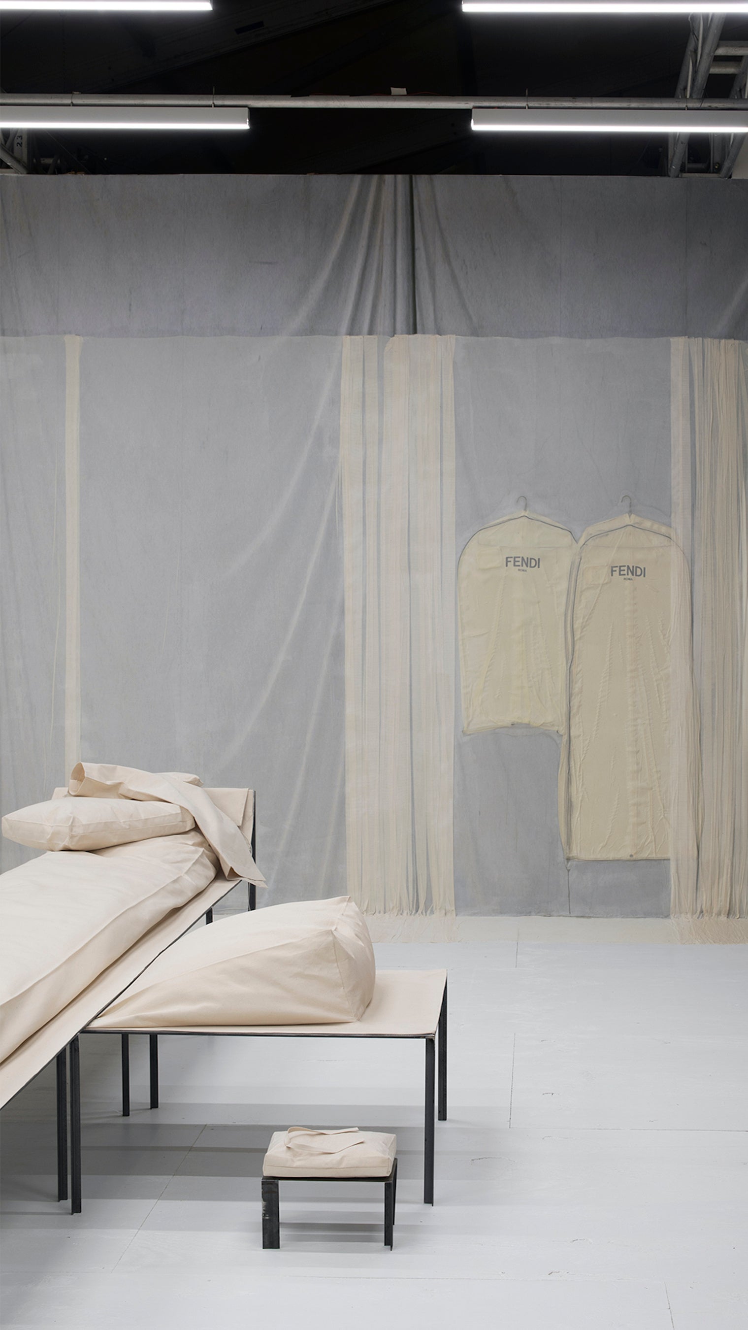 今回の一連の作品では、カンバスが下着と「ドレス」として重ねられた布地と見なされ、それらの素材同士の関係によって、彼は割合や見た目の重さで遊んでいます。身に着けると、「ピロー ポートレート」は着た者の体にアントニオ・カノーヴァ(Antonio Canova)作の「勝利のヴィーナスとしてのポーリーヌ・ボナパルト(Pauline Bonaparte)」や、ティツィアーノ・ヴェチェッリオ(Tiziano Vecellio)作の「ウルビーノのヴィーナス」や「眠れるアドリアーネ」など、対応する美術作品のポーズをとらせます。横たわるローマ皇帝ハドリアヌス(Hadrianus)の彫刻はジョルジョ・デ・キリコ(Giorgio de Chirico)の絵画「メランコリー」を思い起こさせる一方、この作品で女性は フェンディが本拠を置く記念碑的建造物「イタリア文明宮(Palazzo della Civiltà Italiana)を想起させるアーチを背景としています。彼のカンバス彫刻は絵画や美術作品から簡略化された形を抽出するため、それらの歴史や階級、ジェンダーに関する背景は抽象化され、個人的解釈や民主化経験の余地が生まれます。