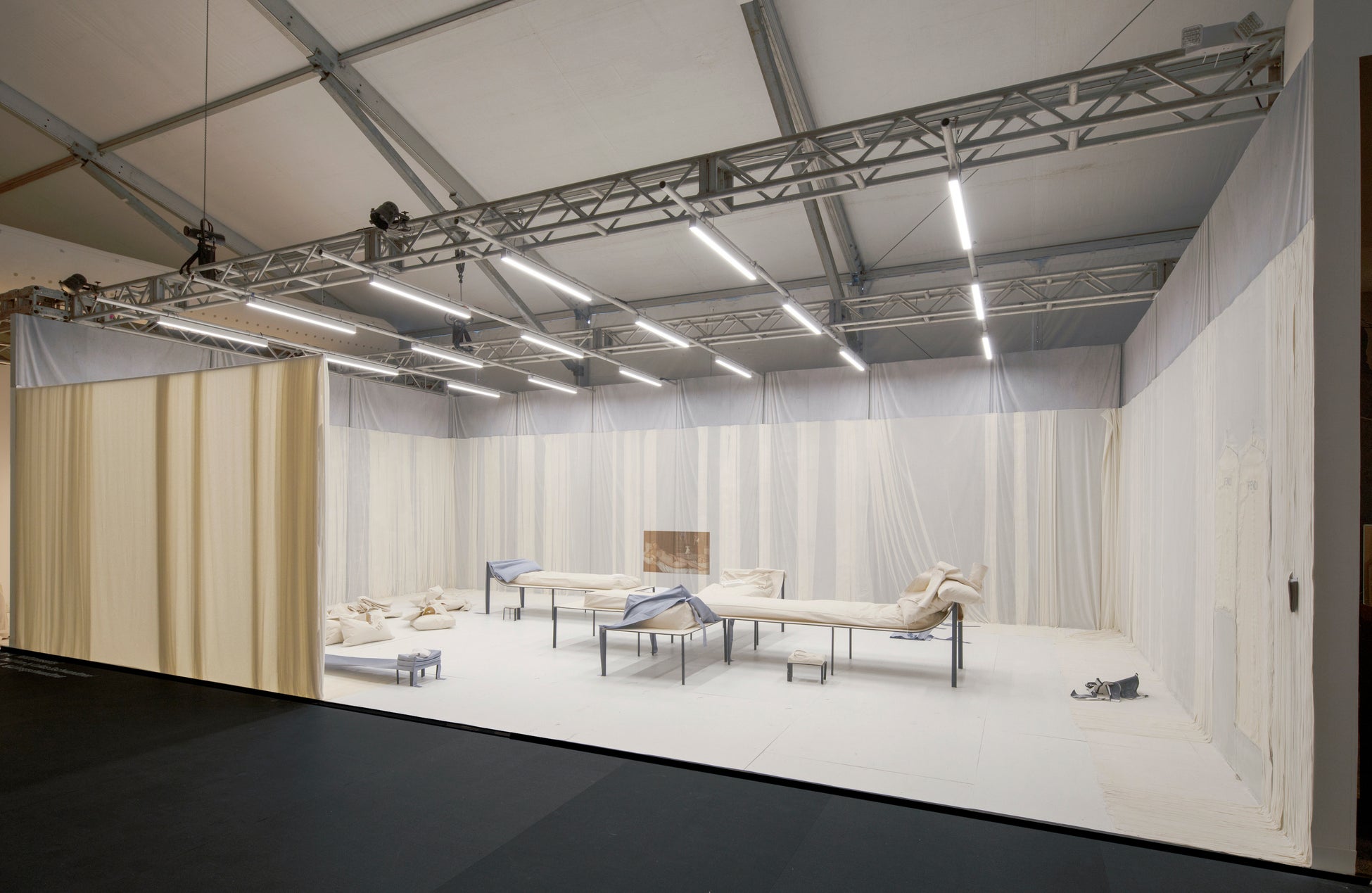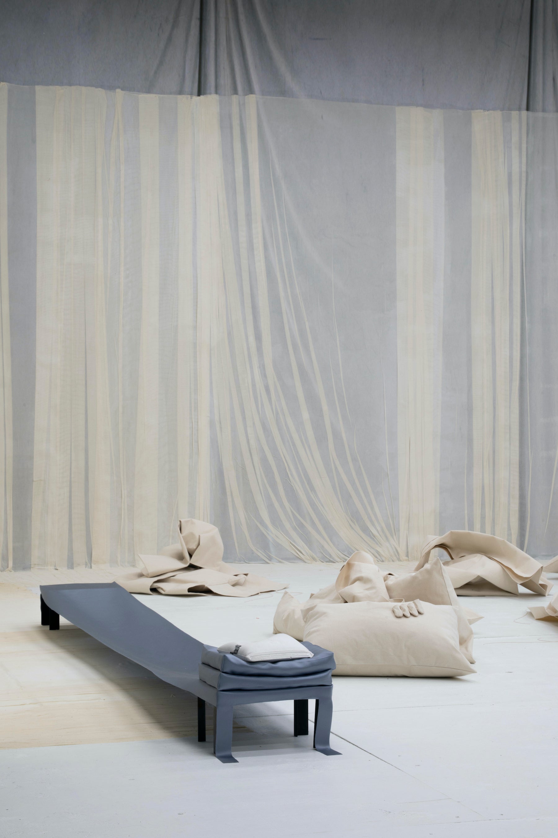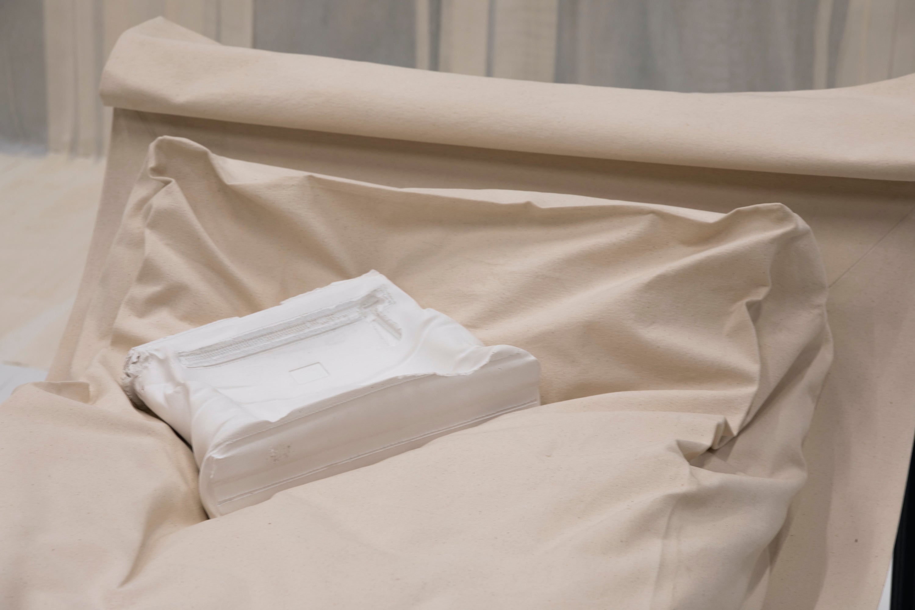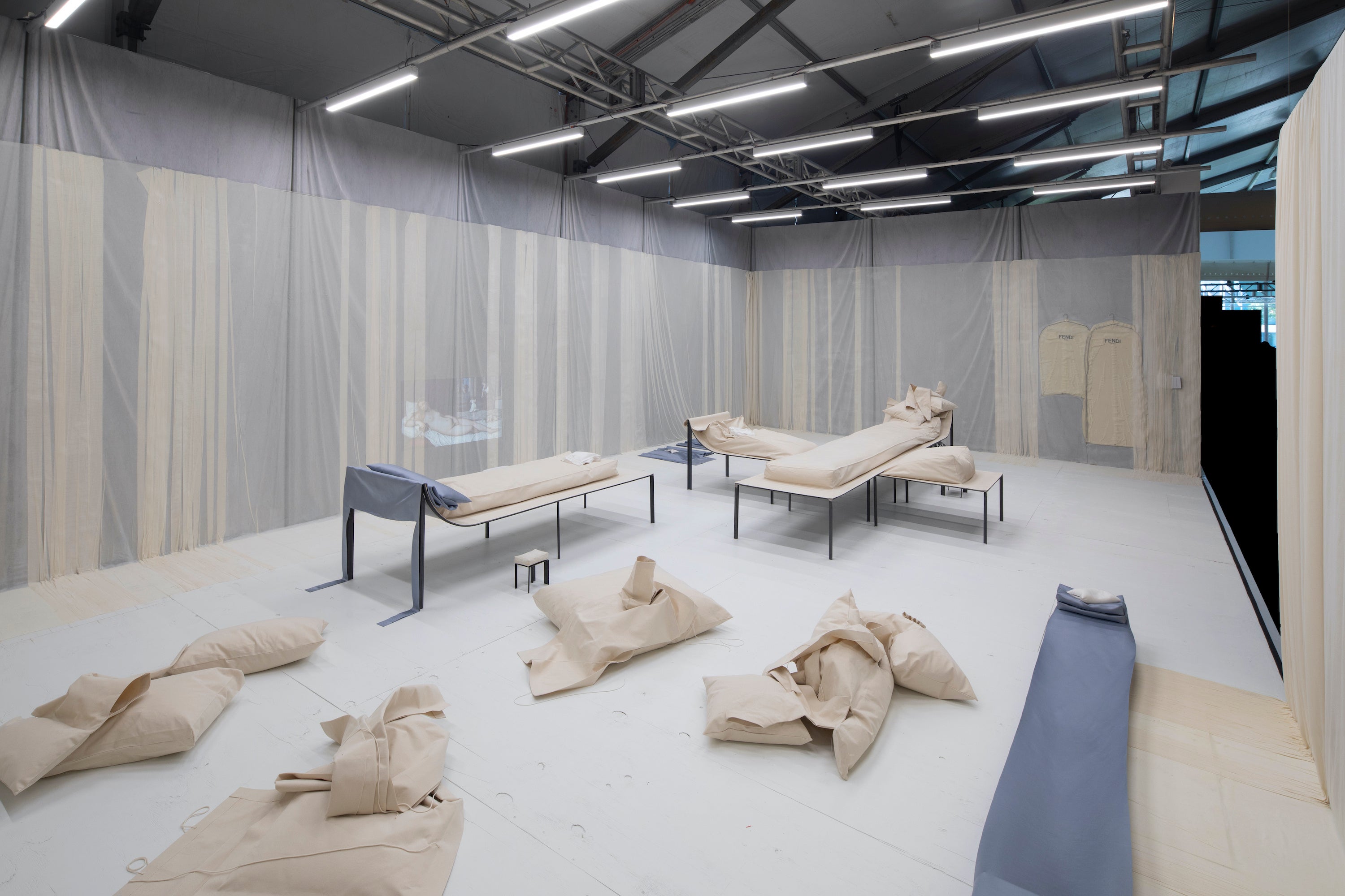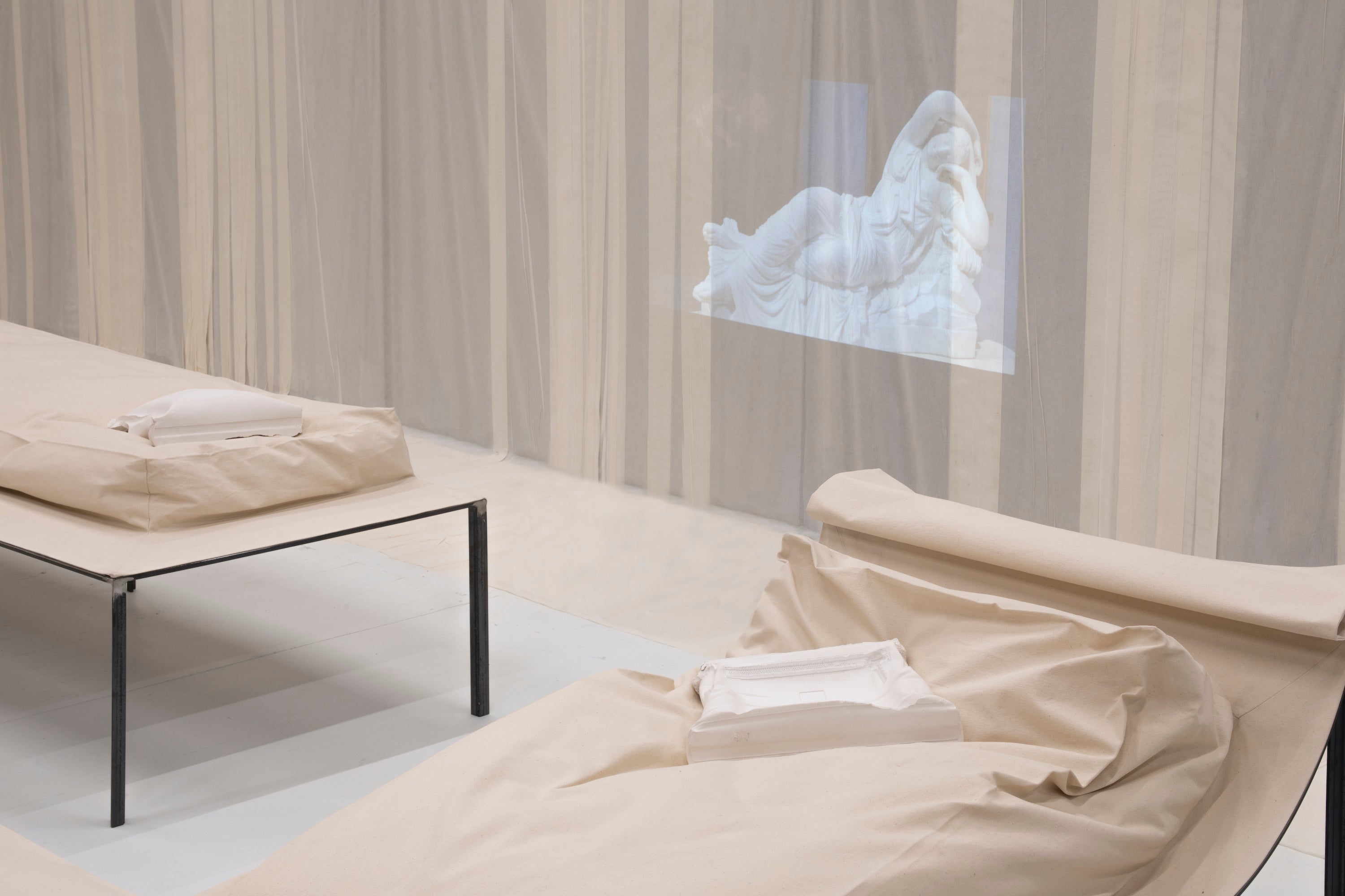 今回の一連の作品では、カンバスが下着と「ドレス」として重ねられた布地と見なされ、それらの素材同士の関係によって、彼は割合や見た目の重さで遊んでいます。身に着けると、「ピロー ポートレート」は着た者の体にアントニオ・カノーヴァ(Antonio Canova)作の「勝利のヴィーナスとしてのポーリーヌ・ボナパルト(Pauline Bonaparte)」や、ティツィアーノ・ヴェチェッリオ(Tiziano Vecellio)作の「ウルビーノのヴィーナス」や「眠れるアドリアーネ」など、対応する美術作品のポーズをとらせます。横たわるローマ皇帝ハドリアヌス(Hadrianus)の彫刻はジョルジョ・デ・キリコ(Giorgio de Chirico)の絵画「メランコリー」を思い起こさせる一方、この作品で女性は フェンディが本拠を置く記念碑的建造物「イタリア文明宮(Palazzo della Civiltà Italiana)を想起させるアーチを背景としています。彼のカンバス彫刻は絵画や美術作品から簡略化された形を抽出するため、それらの歴史や階級、ジェンダーに関する背景は抽象化され、個人的解釈や民主化経験の余地が生まれます。