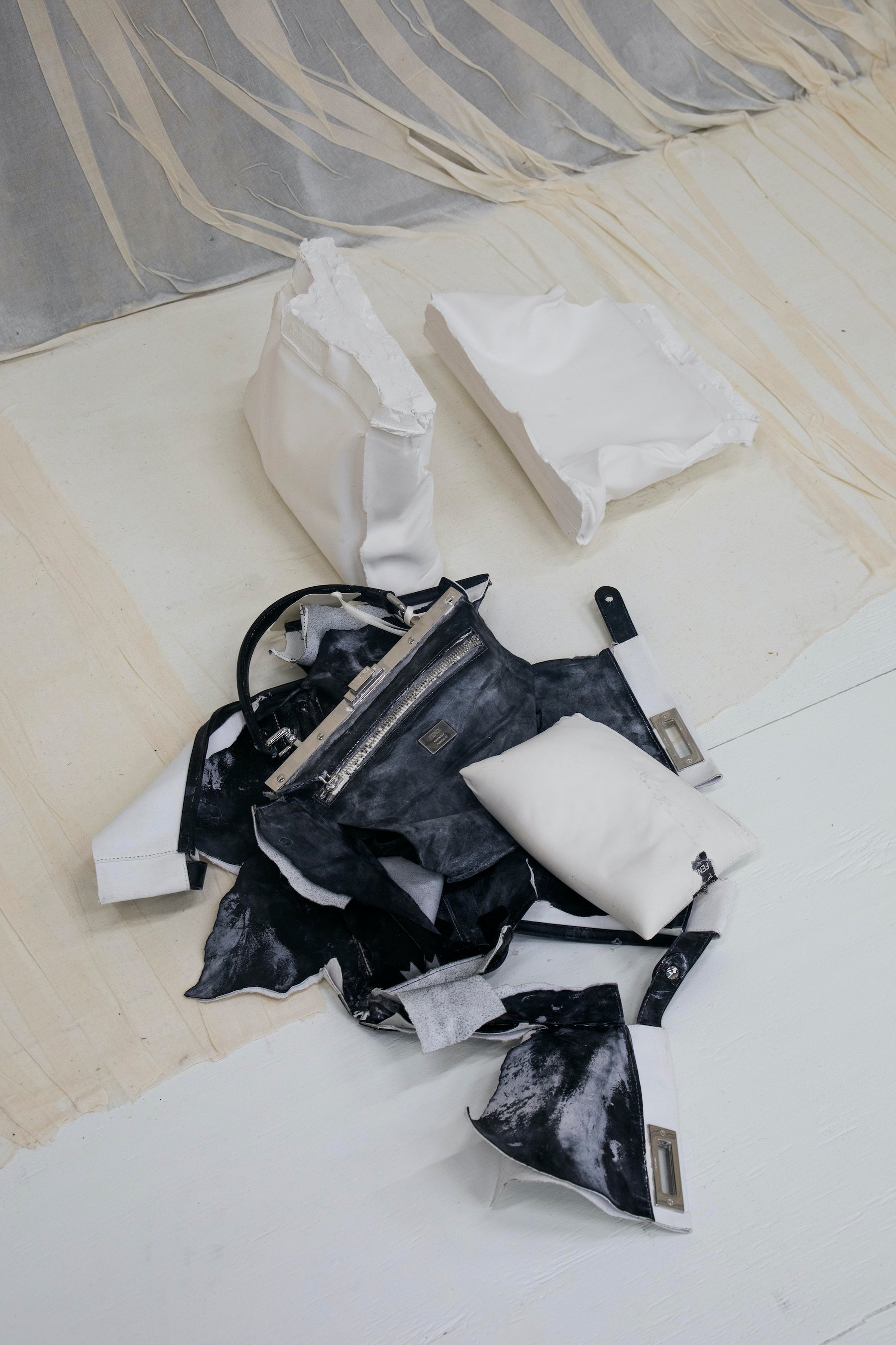 更に、ルーカス・グシュヴァントナーはリサーチを通じて、フェンディのレザー製造の歴史と、彼自身がウィーンでレザークラフトに携わった経験とにつながりを見出しました。彼は、ウィーン市立ファッション大学ヘッツェンドルフ校で14歳からレザーアクセサリー作りを学んだのです。アトリエで生成りのコットンから作られるキャラコという重い平織布を使うところにもつながりを見つけました。ファッション業界では、トワルと呼ばれる柄を試すために作られる最初の衣服によく使われますが、グシュヴァントナーの活動においても重要なモチーフとしてすでに確立されておりこれによって彼は形そのものに集中できるのです。