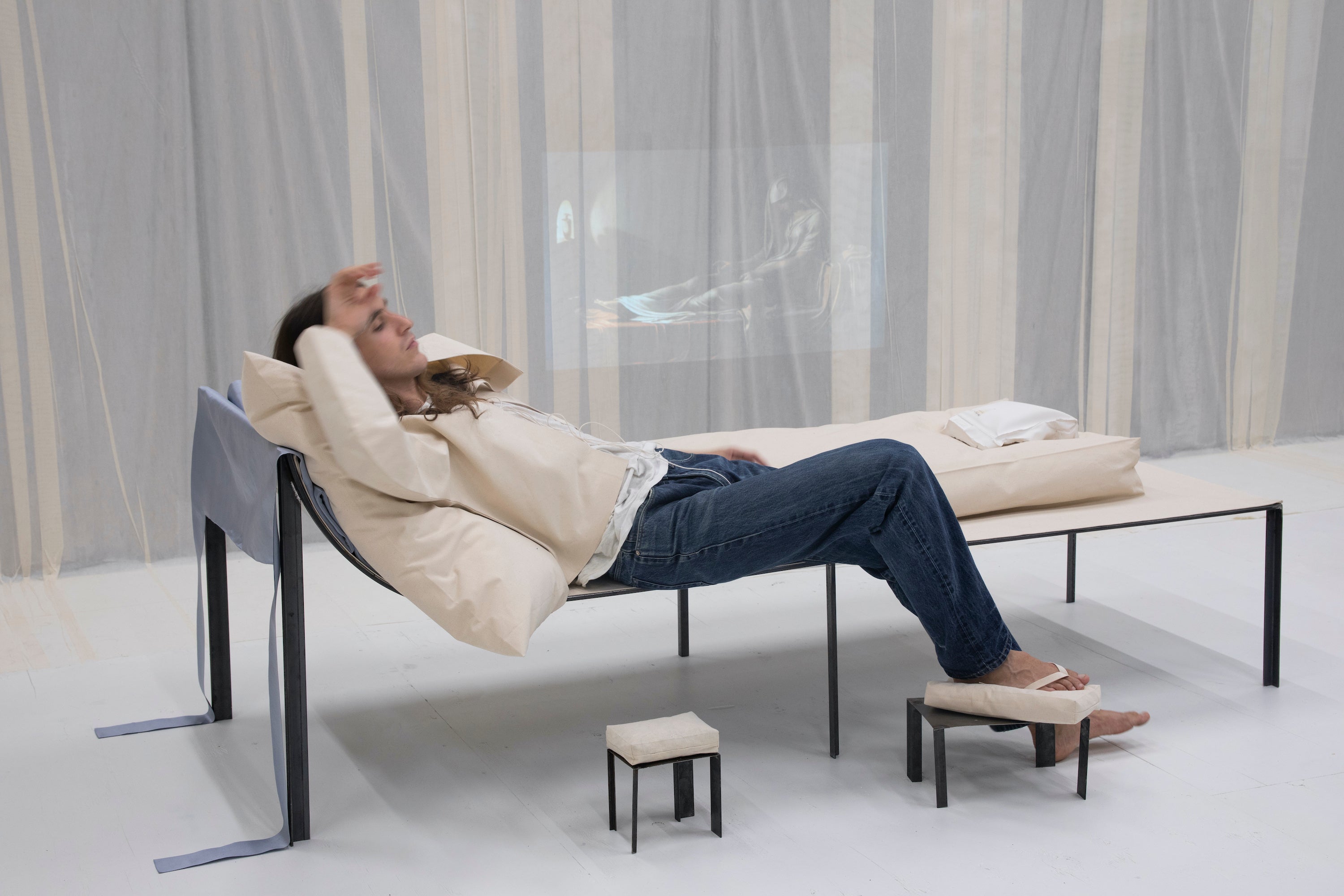 ルーカス・グシュヴァントナー(°1995 / AT)の作品は人体の大きさと寸法、歴史と現代の双方を背景とする建築や家具、オブジェとの相互作用に関わっています。彼はひとつの家具、そして社会がもくろむボディランゲージと使用されることでそのもくろみがどのように解釈され、別の目的へと振り向けられるかを探ります。彼はヘッツェンドルフ校で14歳からレザーアクセサリー作りを学び、そこでクラフツマンシップを発揮してオブジェを作ることや、建築技術を学ぶことで2D(平面)から3D(立体)へと変わるパターンを作り出すことに出会いそれは彼の作業工程の重要な一面となりました。このあとはロンドンで学び、チェルシーカレッジで建築と美術を組み合わせるようになります。そこでは自身の作品の大きさについて実験することができました。