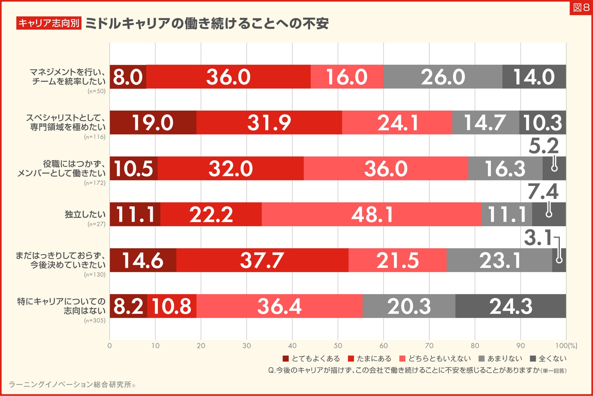一方、「キャリア志向なし」「管理職志向」は、4割以上がキャリアを描けず働き続けることへ不安を感じることが「あまりない」「全くない」と回答しました。(図8)。