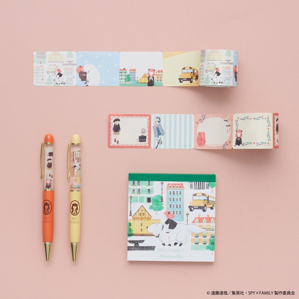 ”デフォルメ”されたアフタヌーンティーオリジナルのデザインは全部で4種類。アニメの舞台の街並みをかろやかに駆け回るアーニャとボンドの姿を描いた「タウン」や、ロイド、アーニャ、ヨルの3人とボンドがティータイムを楽しむ「ホーム」、その他「クローゼット」「スウィート」をテーマにした心温まるデザインに仕上げました。淡いピンクとエメラルドグリーンを基調にした大人も持ちやすいステーショナリーアイテムや、ティータイムを楽しめるティーフォーワンなどが揃います。