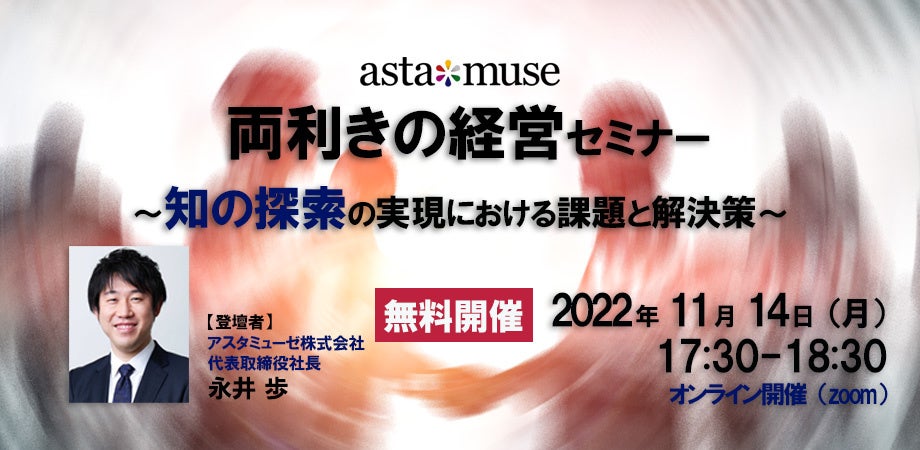 アスタミューゼ株式会社(本社:東京都千代田区、代表取締役社長 永井歩)は、2022年11月14日(月)17:30-18:30に、「両利きの経営セミナー ~知の探索の実現における課題と解決策~」と題した無料ウェビナーを開催いたします。