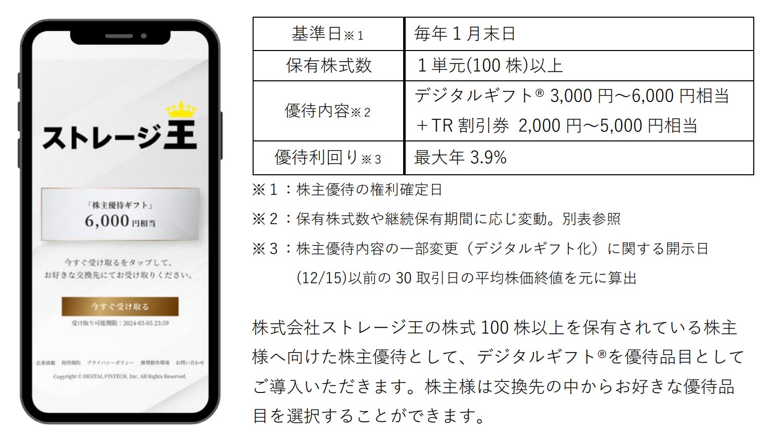 株式会社ストレージ王(代表取締役社長執行役員:荒川 滋郎、東証グロース市場:証券コード2997)において、株式会社デジタルプラス(代表取締役社長:菊池 誠晃、本社:東京都渋谷区、東証グロース市場:証券コード3691)グループが運営する「デジタルギフト®」を株主優待としてご活用いただくことになりました。